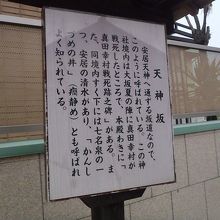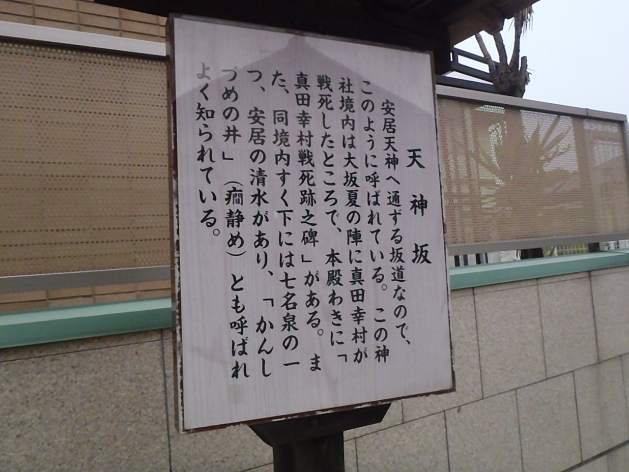 案内板によると、安居天神へ通じる坂道なのでそう呼ばれるそうで、大坂夏の陣で真田幸村が戦死したところとして伝わる境内には戦死跡の碑や七名泉の一つ安居の清水がありかんしづめの井と呼ばれたいへん有名なそうです。