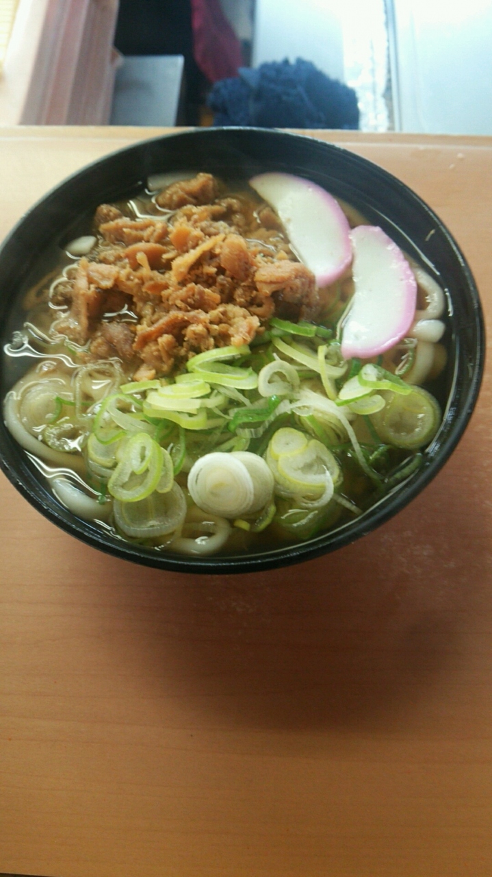 立ち食いのため、ミンチに近いかしわを入れたシンプルなうどんですが、このかしわの甘いエキスがうどんと絶妙にマッチしてかなり美味しかったです。