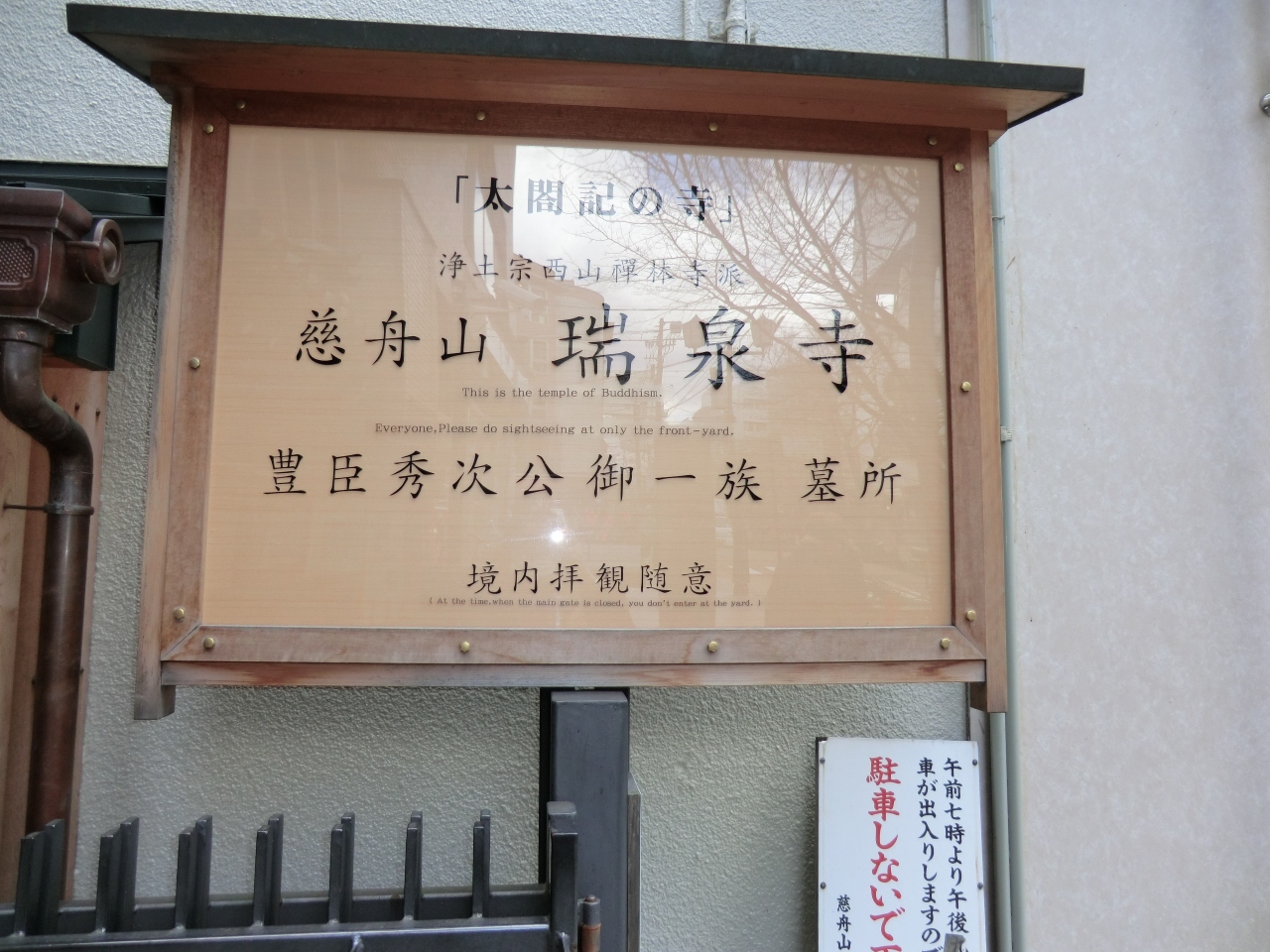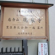 豊臣秀次とその一族の墓所があるお寺です。というより、このお寺が元々秀次の菩提を弔うために建立されたものです。角倉了以が高瀬川を開削した時に、秀次とともに埋めららた石塔が発見され、了以の弟が秀次に仕えていたこともあり、了以が寺を建立し、秀次の戒名から「瑞泉寺」と名付けました。