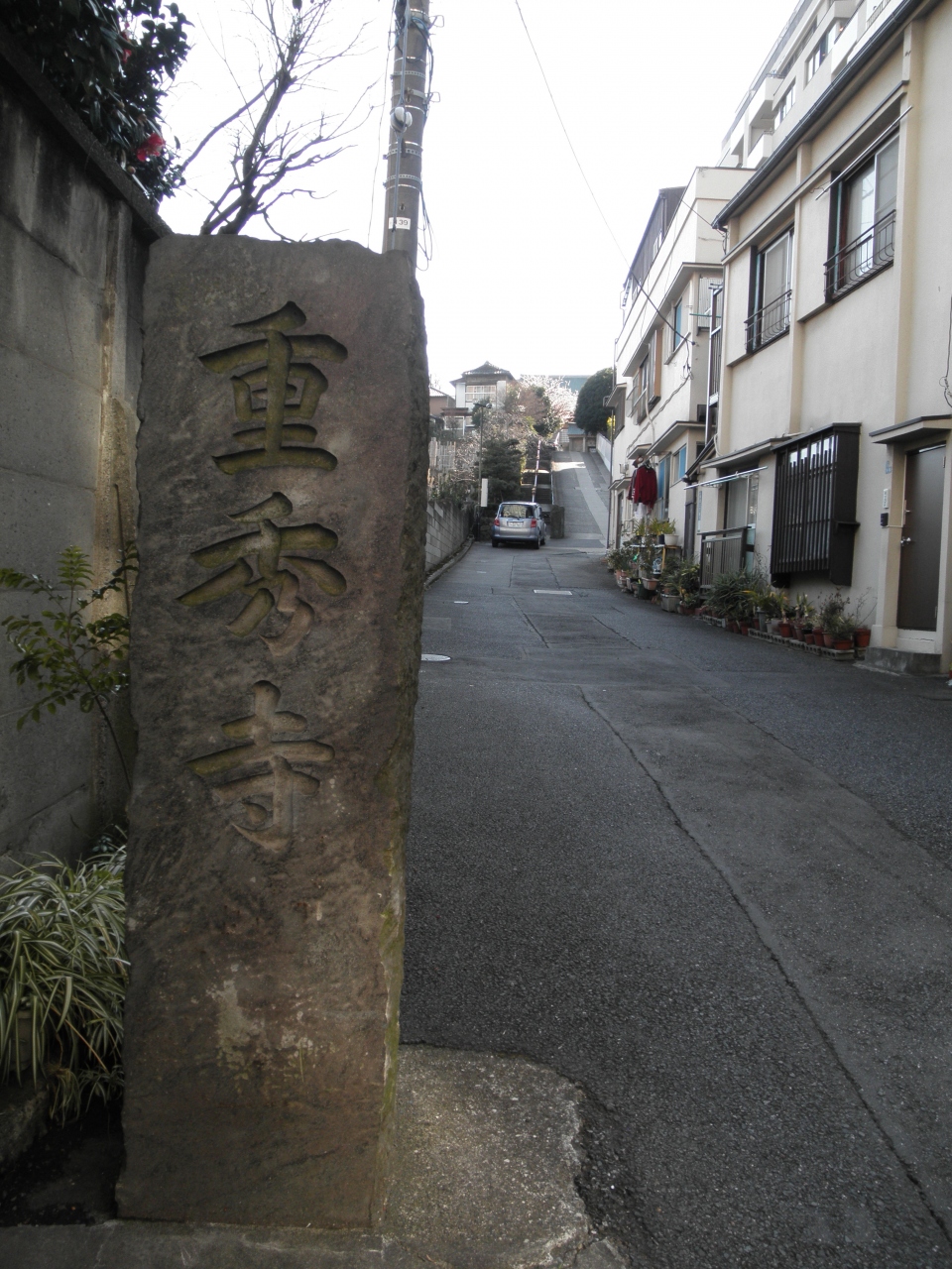 白金高輪駅から恵比寿駅へと向うバス通り沿いを数分行くと左手に「重秀寺」とかかれた看板がありました。ここから長い坂道をのぼった所にお寺がありました。中を拝観していたら「お墓の見学ですか?」とお寺の方に声をかけられました。墓地の販売に熱心な様です。
