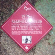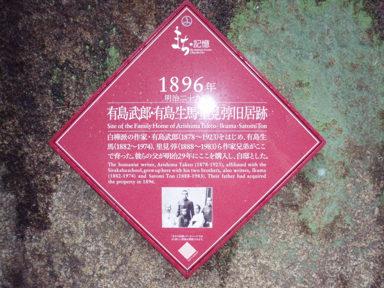 JR四ツ谷駅から新宿通りを半蔵門方面へ行き左手の番町文人通りへ入り8分ぐらいで高級マンションのベルテ6番町の石垣に案内プレートがあります。案内プレートには作家有島武郎(1878~1923)、有島生馬(1882~1974)、里見(1888~1983)作家兄弟がここで育ったとあります。