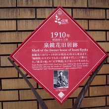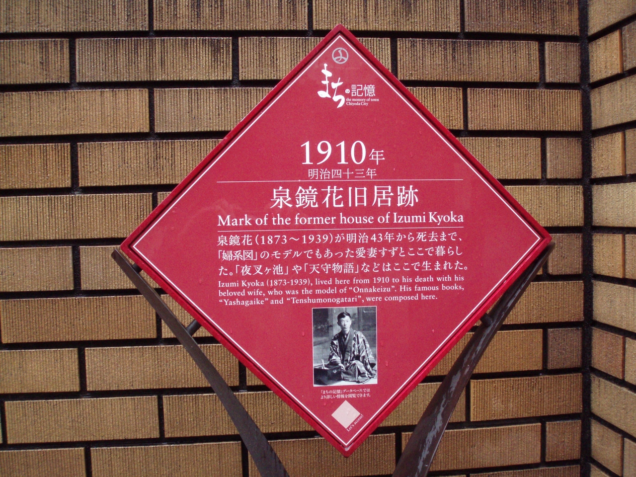 JR四ツ谷駅から新宿通りを半蔵門方面へ行き左手の番町文人通りへ入り8分ぐらいで有島武郎・有島生馬・里見旧居跡の角を左に曲がってすぐの高級マンションの塀に泉鏡花旧居跡案内プレートがあります。泉鏡花が愛妻すずと明治43年から亡くなるまでこの地で暮らし「夜叉が池」や「天守物語」はこの地で生まれたそうです。残念ながら当時の面影は残ってません。