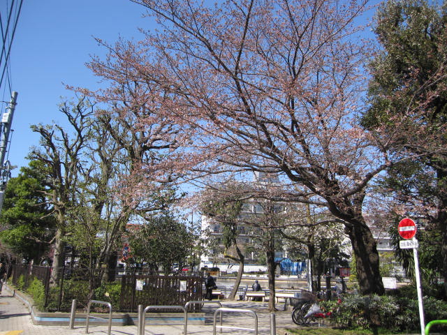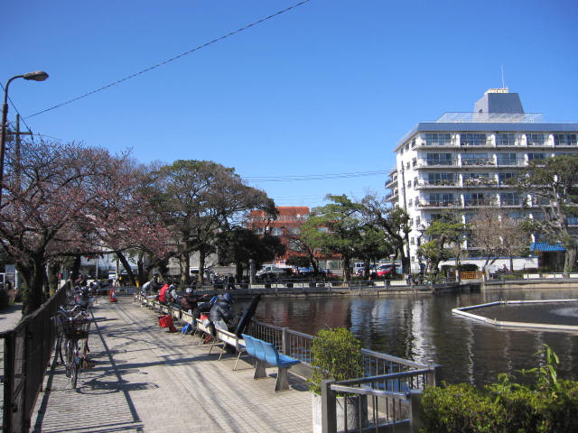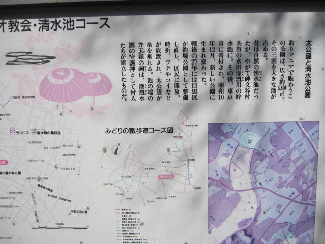 清水池は近くの碑文谷公園の池と同様湧水の池でした。今は公園となっていて釣りをすることが出来ます。朝から結構釣りをしている方がいました。この辺りから、サレジオ教会辺りまでは桜並木となっています。都心では3日前に開花しましたが、このあたりのソメイヨシノはまだ1分咲と言った感じです。