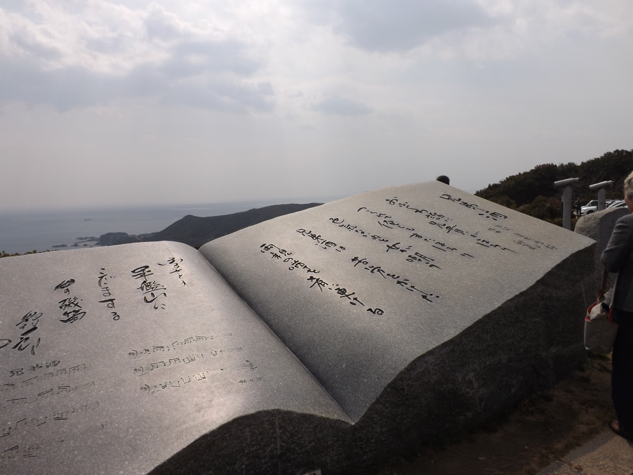 パールロードのハイライトは、やはり鳥羽展望台でしょう。大きな駐車場・店舗・トイレなどが完備されていて、ここから景色を楽しんで下さいと言わんばかりです。確かに、かなりの高台から見る景色は良かったです。ただ、海から離れすぎているのでは。まあ、山の緑と海の青さの両方が楽しめて良いのかも。あと、鳥羽一郎の兄弟酒の歌詞が本の形の石に刻まれていました。どうせなら、兄弟船の方が好きなのですが。