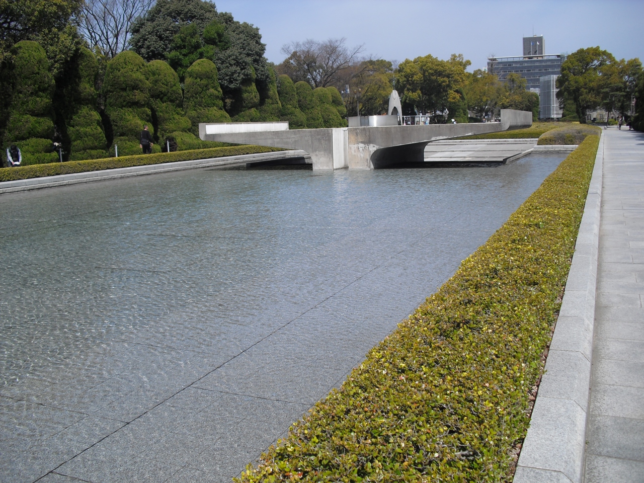 原爆死没者慰霊碑の後ろにある池です。慰霊碑、平和の池、平和の灯という順に並んでいます。8月6日の平和記念式典はこのあたりを中心に行われます。ちょうど水面に原爆死没者慰霊碑が浮かび上がるように設計されています。