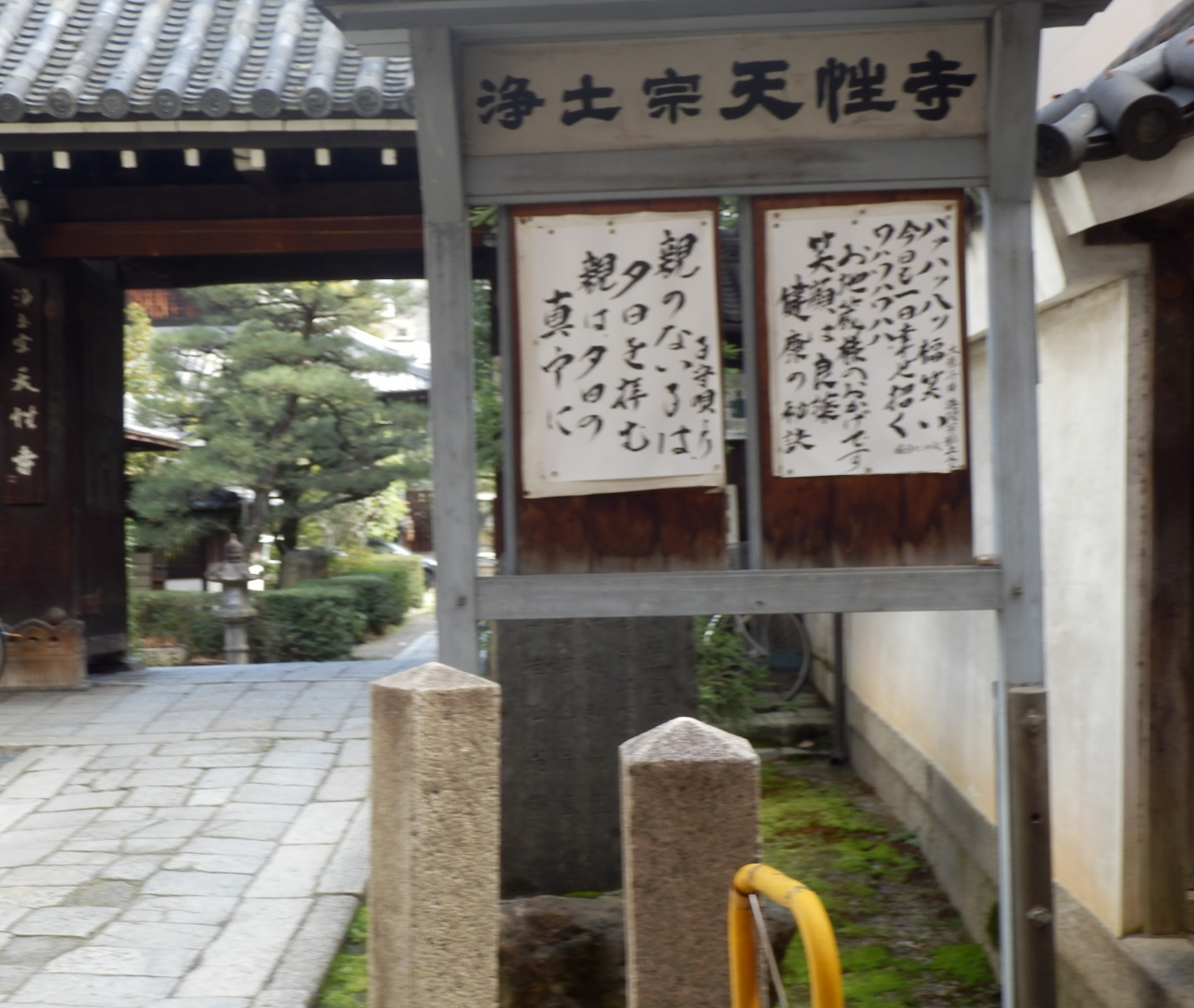 京都の本能寺を参拝後、寺町通を南に下ると三条通に入る手前にあります、三条通からだと矢田寺の角を曲ってください角は交番です、曼荼羅山當麻院天性寺が正式名。浄土宗のお寺、山門に次の言葉が記されていました、ちょっと涙みますね、親のない子は夕日を拝む親の夕日の真中に