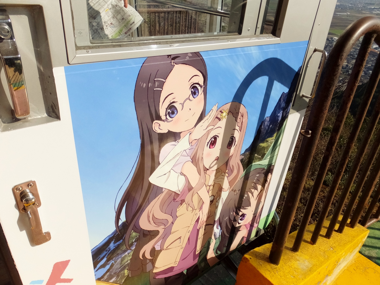 ロープウェイには、”女の子だけのゆるふわアウトドア”アニメ『ヤマノススメ』の女の子が書かれていてとても可愛いです。