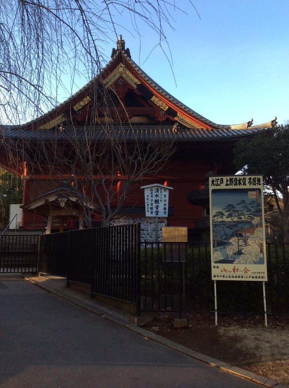 上野恩賜公園の中にあります。西郷隆盛の銅像から近いです。1631(寛永8)年に京都の清水寺に安置されていた千手観世音菩薩を天海僧正に献じたことによって、天海僧正が、京都の清水寺に倣って建立したお堂です。