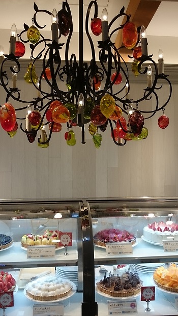 このお店、フルーツをたっぷり使用したタルト系のケーキが充実しています。セルフ形式のデリスタルト&カフェなので、ケーキ正直そこそこお高いですが、セルフなお店なのです。ここのお店、入口にフルーツを模したかわいいシャンデリアがおかれていてすごくこれかわいいです。