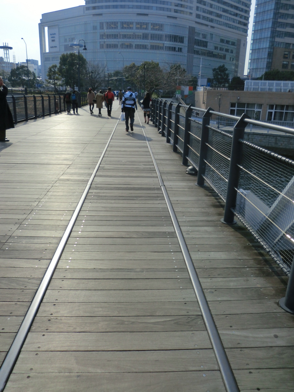当日は天気が良かったので、散策するには最高です。JR桜木町から海の方に歩いて5分で、汽車道です。下を見ると、何と線路があります。だから汽車道ですね。車椅子もOKです。左手に海をみながら、赤レンガ倉庫のほうへ歩きます。当日は日曜日だったので、人もたくさんでした。