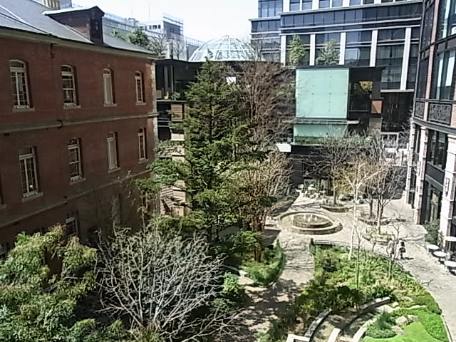 ちょっとした中庭のようになっており、緑や噴水があり、昼時にもなるとサラリーマンが憩っています。ベビーカーで散歩するママの姿も時折みます。