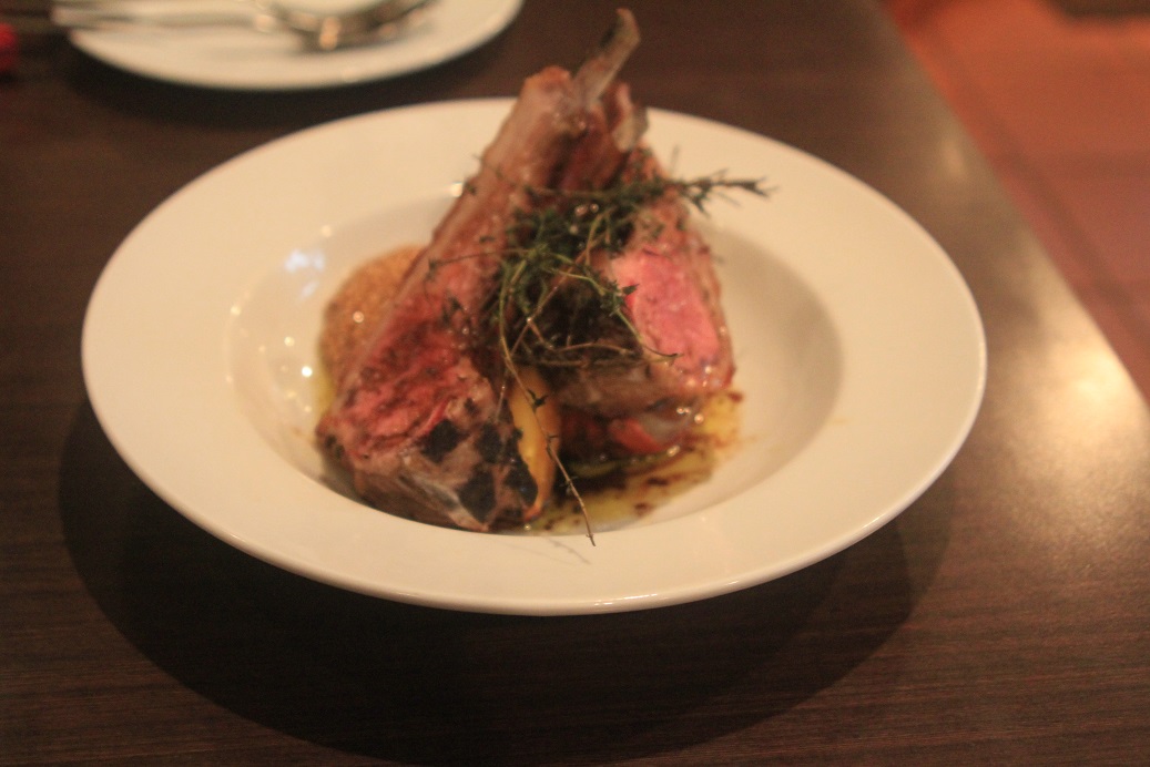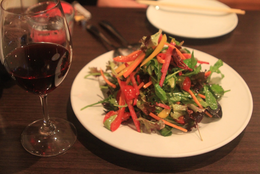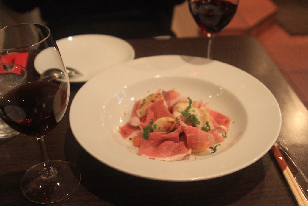 ホタテ&生ハムの盛り合わせ、七色のグリーンサラダ、仔羊ロース肉のローストなどの料理と厳選されたワインは良く合って、とても美味しかったです。