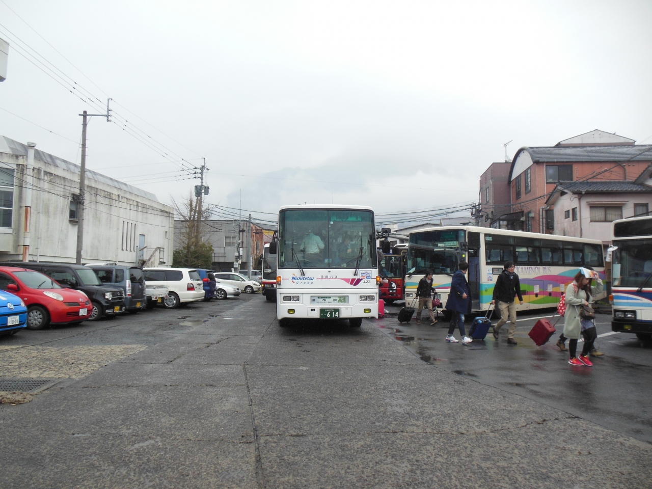 各地から来たバスは、このバスセンター裏の空き地に停車します。屋根がないので雨の日は気をつけてください。