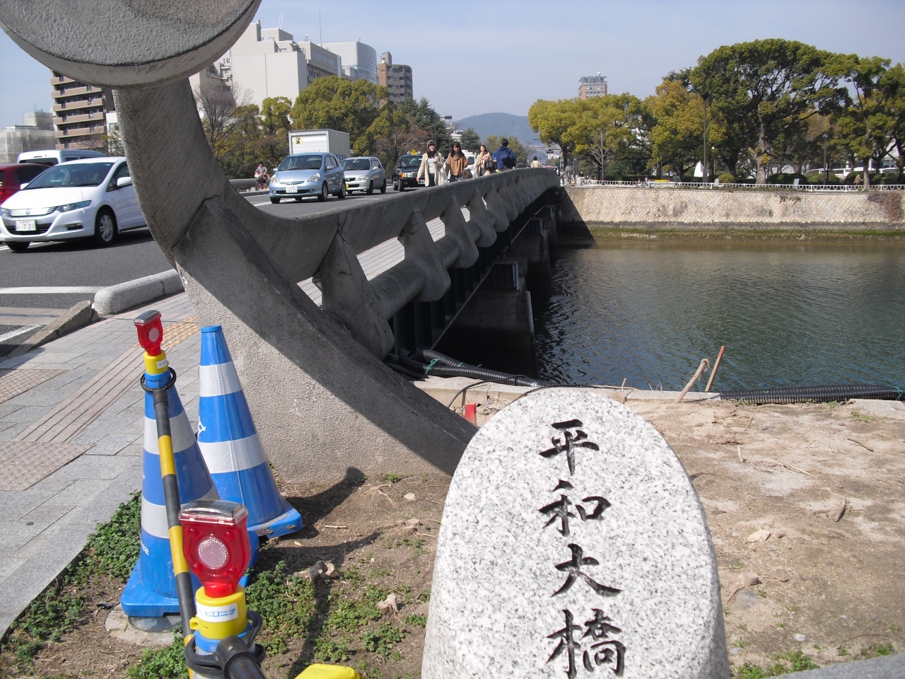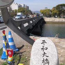 平和大通りを西側(NHKがある側)から歩いていくと元安川があります。そこにかかっている橋が平和大橋です。この橋を渡ると平和公園の南側の入り口になります。またさらに行くと本川という川にかかる西平和大橋があります。平和公園は元安川と本川に囲まれた公園です。