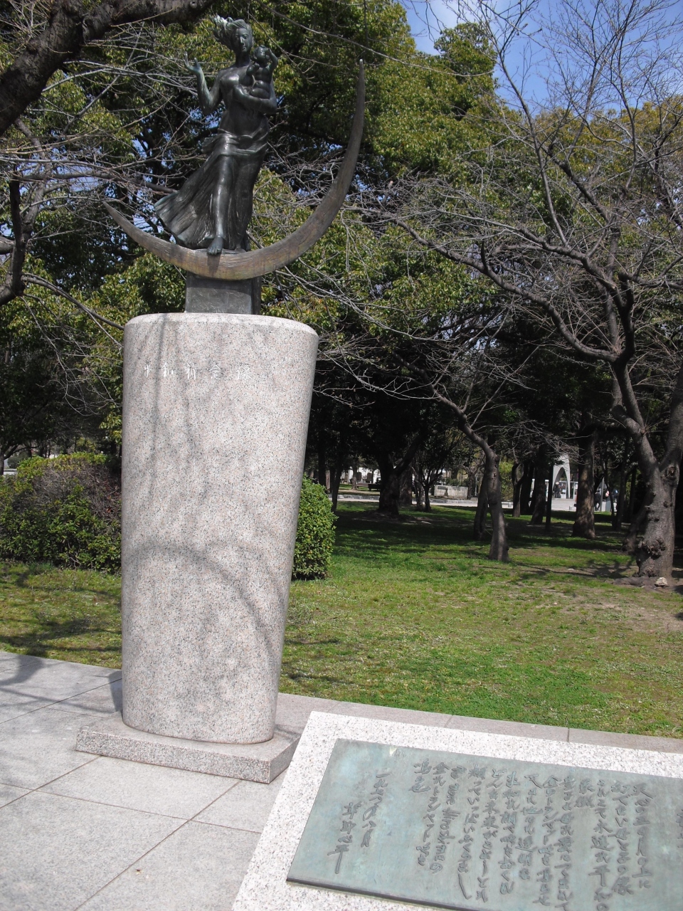 原爆死没者慰霊碑や平和の池のそばの木立のなかに、草野心平の詩と共にあります。ちょうど原爆死没者慰霊碑を見守るような形になっています。親に抱かれた子どもが平和のトランペットを吹いている様子が表現されています。平和公園にはこのような像がたくさんあってこの像の作者の円鍔勝三(えんつば かつぞう)氏の像は他にもあります。