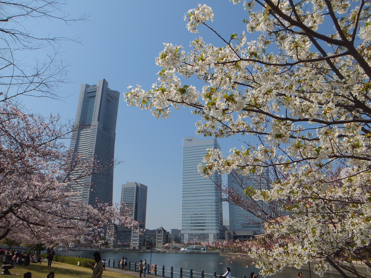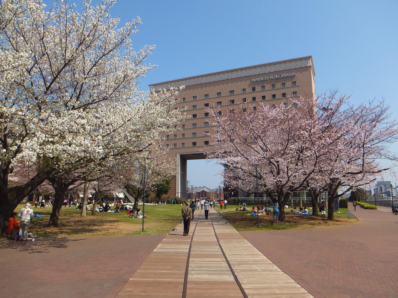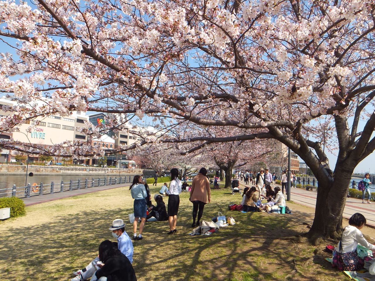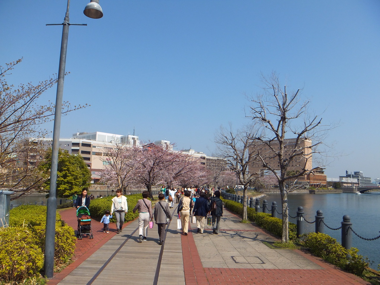 満開の桜並木を一目見ようと、多くの花見客で賑わっていました。汽車道の桜は若い桜が多く、一段低いところに植えられたため目の位置で花を見て楽しむことができます。