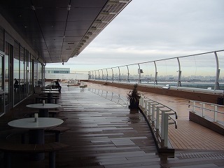 あいにくの雨でした。もちろん、晴れているに越したことはありませんが、最低限の眺望は楽しめました。というのも、屋外デッキ部分の一部が、屋根付きになっていて、その下にテーブル席などがあるので、濡れずに見学ができるためです。