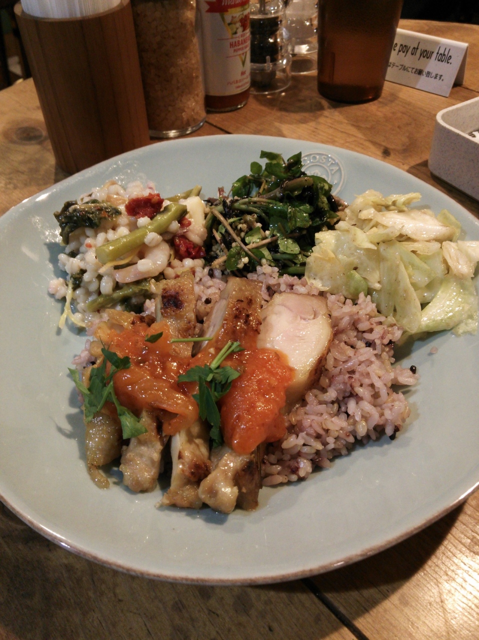 メインのチキンはしっとり柔らかで美味しい!そして副菜は野菜料理なので外食でも野菜がとれて嬉しいです。クレソンの和え物(サラダ?)は、大好きなクレソンをモリモリ食べれて幸せでした。通路にテーブル席が出ているような雰囲気なので落ち着くって雰囲気ではないのですが、あまり人通りが多くないのでそれほど気になりません。