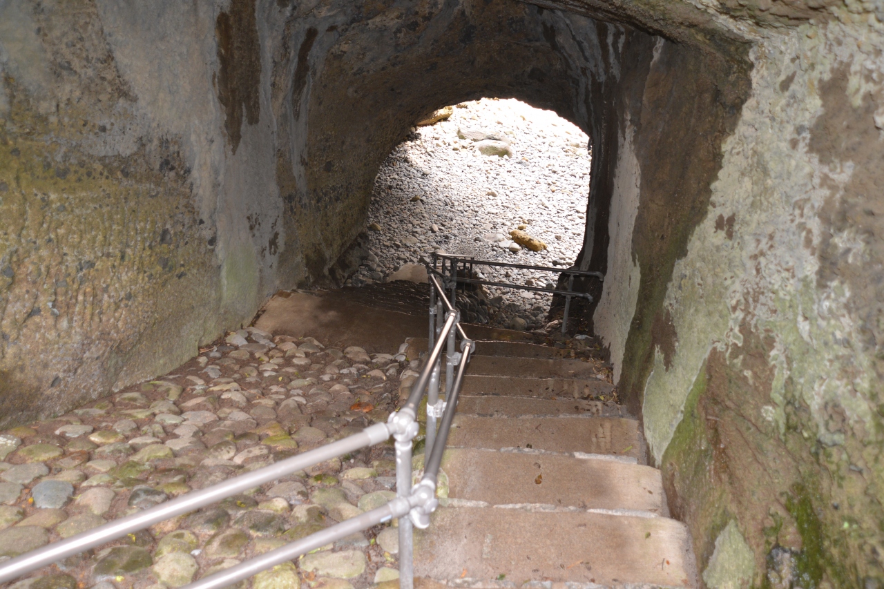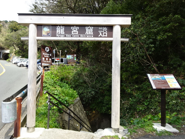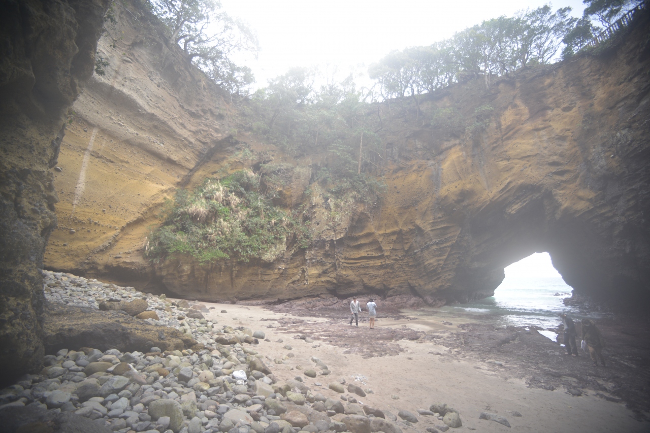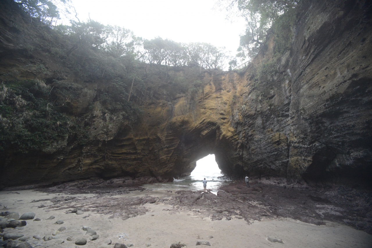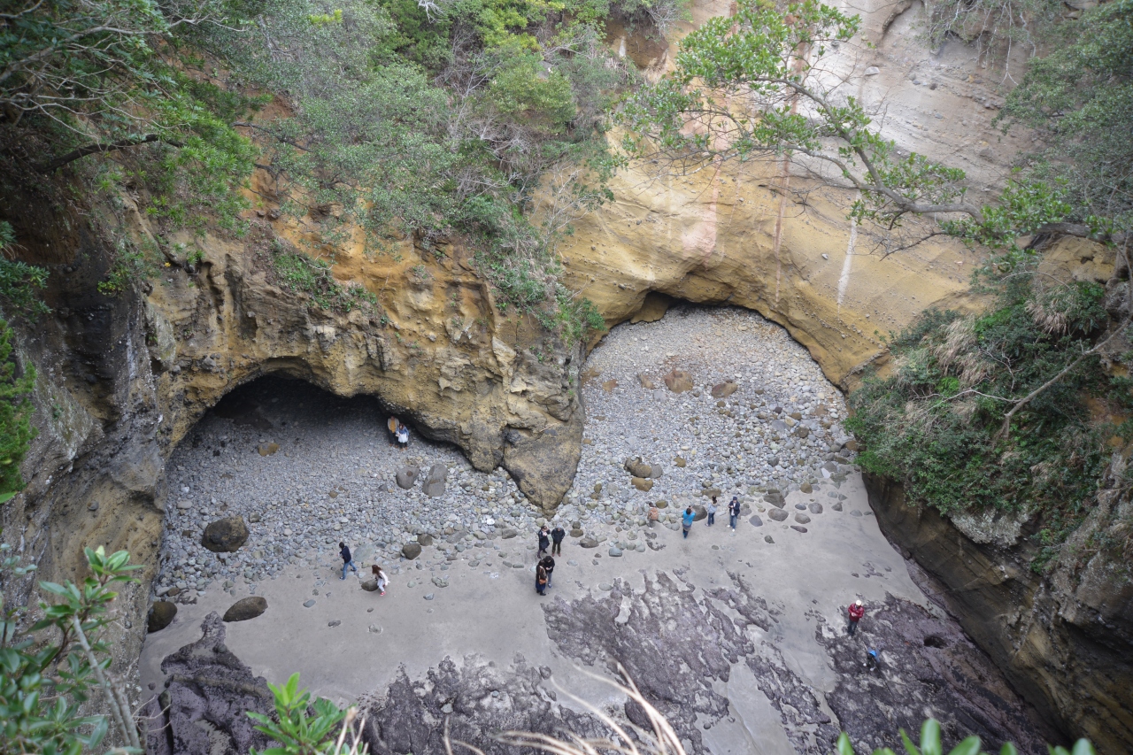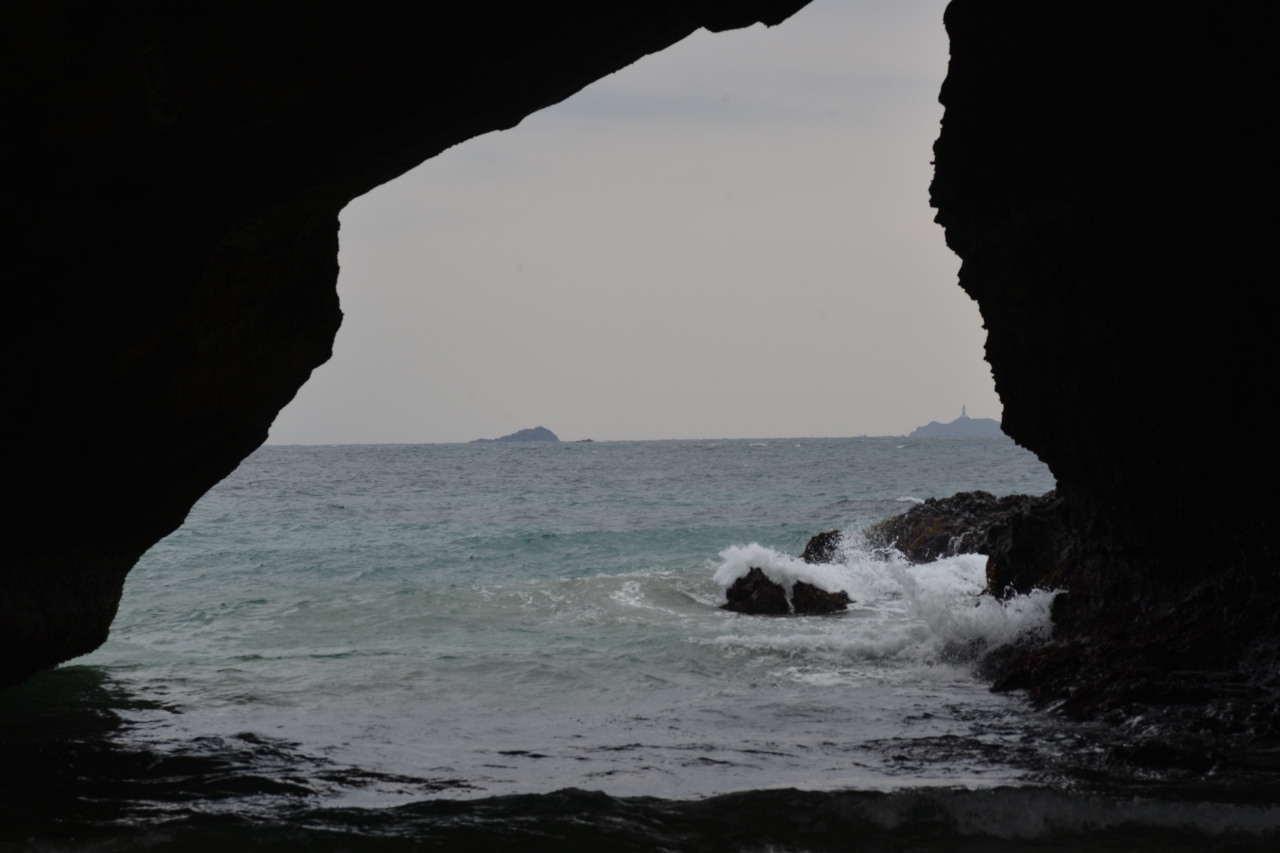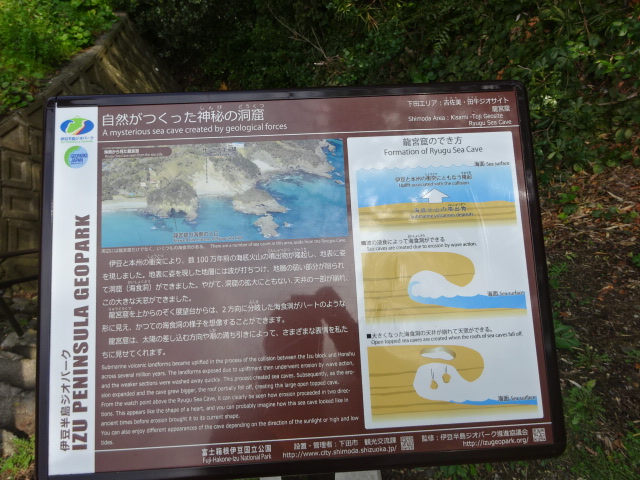 階段を下りて穴をくぐり抜けると、周囲が切り立った壁に囲まれ、前方の穴から海水が流れ込んでくる地形となっています。外とは別世界のような不思議で神秘的な空間が広がっています。波の浸食作用によってできた洞窟だと解説されていました。聞こえる音は波の音だけ。心も体もリラックスできる居心地のよい場所です。波はそれほど入ってこないので夏は磯の観察やスノーケリングができそうです。上部を周遊する遊歩道があり、中を覗くことができます。ハート型の浸食をみることができます。