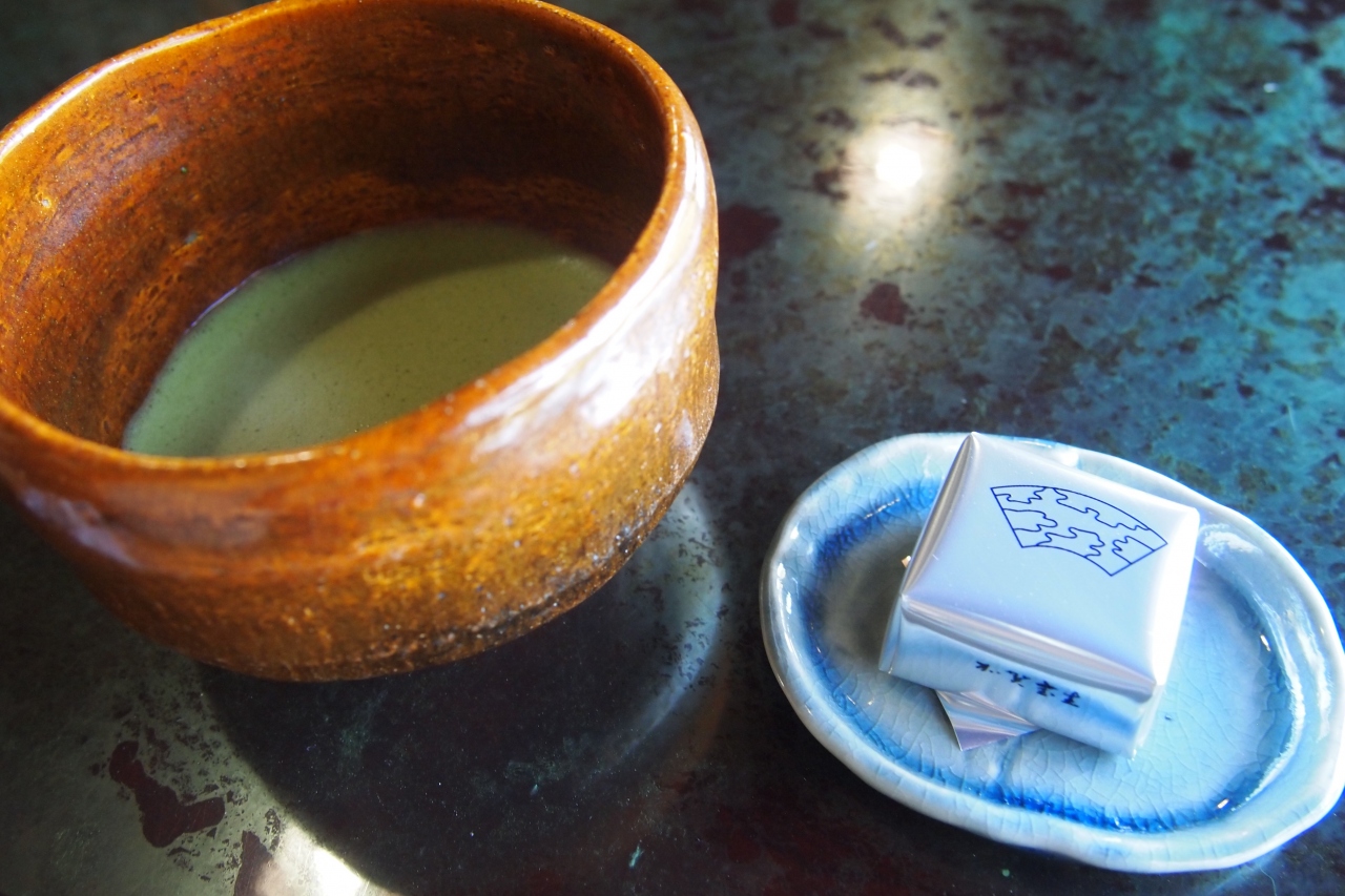 通して頂いた席は本当に絶景を臨める席でした!目の前が霞ヶ池、広がった松の木も美しく調和されていてこの開放的な雰囲気の中頂けるお抹茶は贅沢の一言。特別なおかしが出て来る訳ではありませんが、お茶碗が伝統工芸品であったりと細かい所にこだわりが。