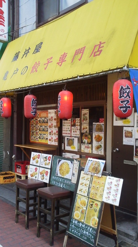 亀戸駅の北口エリアをちょっと歩いたところにある餃子の専門店がここ「亀戸の餃子専門店 藤井屋」。亀戸には”亀戸 餃子”という有名店がありますが、割と近くにこのお店がある感じです。お店的には黄色い看板の目印のいわゆる食堂という雰囲気です。今回はがっつりと餃子の”大人食い”なるものを行いました。餃子好きにはたまらない至福の時でした。平日の昼間ということもあり、ビールが飲みたいくらいでした。残念!