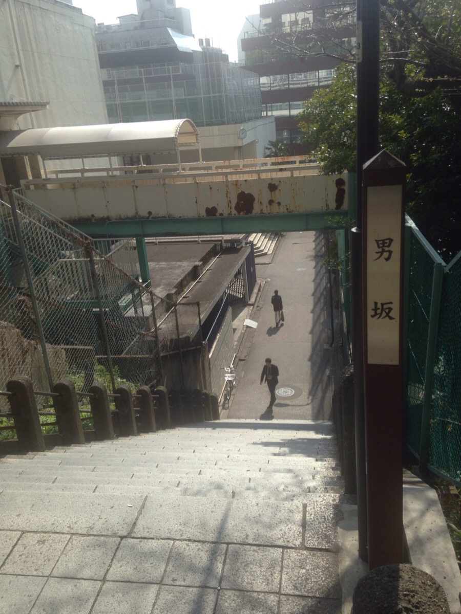 お茶の水駅の東側の改札からちょっと歩いたところにある坂道というか階段がここ「男坂」。この駿河台エリアにはとにかく、坂道が多く、しかも、しっかりとネーミングされたものがあります。都内でも坂道が多いエリアはありますが、駿河台にも、とにかく坂道が多いです。しかもこの”男坂”と”女坂”というネーミングも各所にあります。この男坂は、想像通りの厳しい勾配の階段になっています。”男”というネーミングなのでしょうがないですね(がんばりましょう)。近くの女坂よりは、やっぱり急こう配な感じでした。