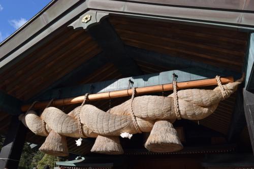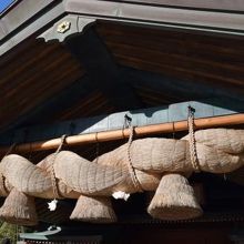 正面破風下に張られた長さ13m、周囲9m、重さ5tの大注連縄は日本トップクラスである。