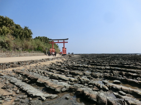 青島に渡る入り口付近に有料駐車場がある。参道というか遊歩道沿いには店が立ち並ぶ。ここで、名物、肉巻きやマンゴーアイスクリームを食べる。海岸に出ると、青島まで景色がいい。海風が強くない晴天の日に来たいところ。鬼の洗濯岩では、小さな生物がいて、子供がいると楽しめる。青島神社の向こう側にも鬼の洗濯岩が広がるが、あまり、誰もいかない。人力車?もある。