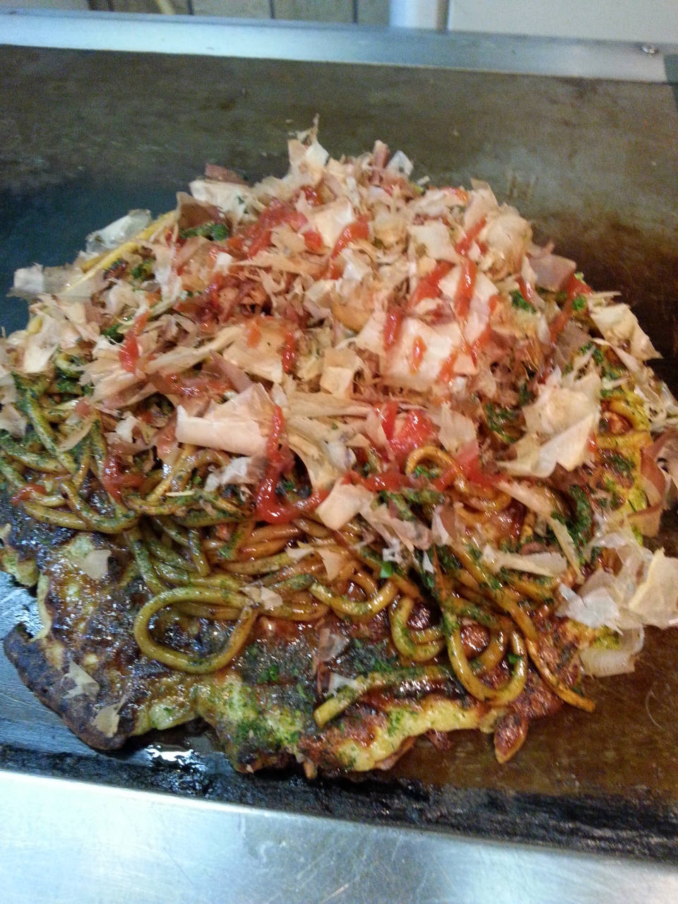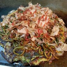 メニューには当然モダン焼きもあるが、お好み焼きの上に焼きそばを乗せた「座ぶとん」が有名な店。これだけでも2人前のボリュームなのだが、ランチ時は120円プラスでご飯とお味噌汁が付きガッツリいただける。味は昔ながらのホッ♪とできる風味で、安心できる美味しさである。ご主人のおっちゃんは愛想よく、おばちゃんは水が少しでも減るとスグに何度も継ぎ足してくれサービス満点である、昼を過ぎても客入りが途絶えない理由もうなずける。