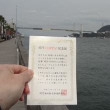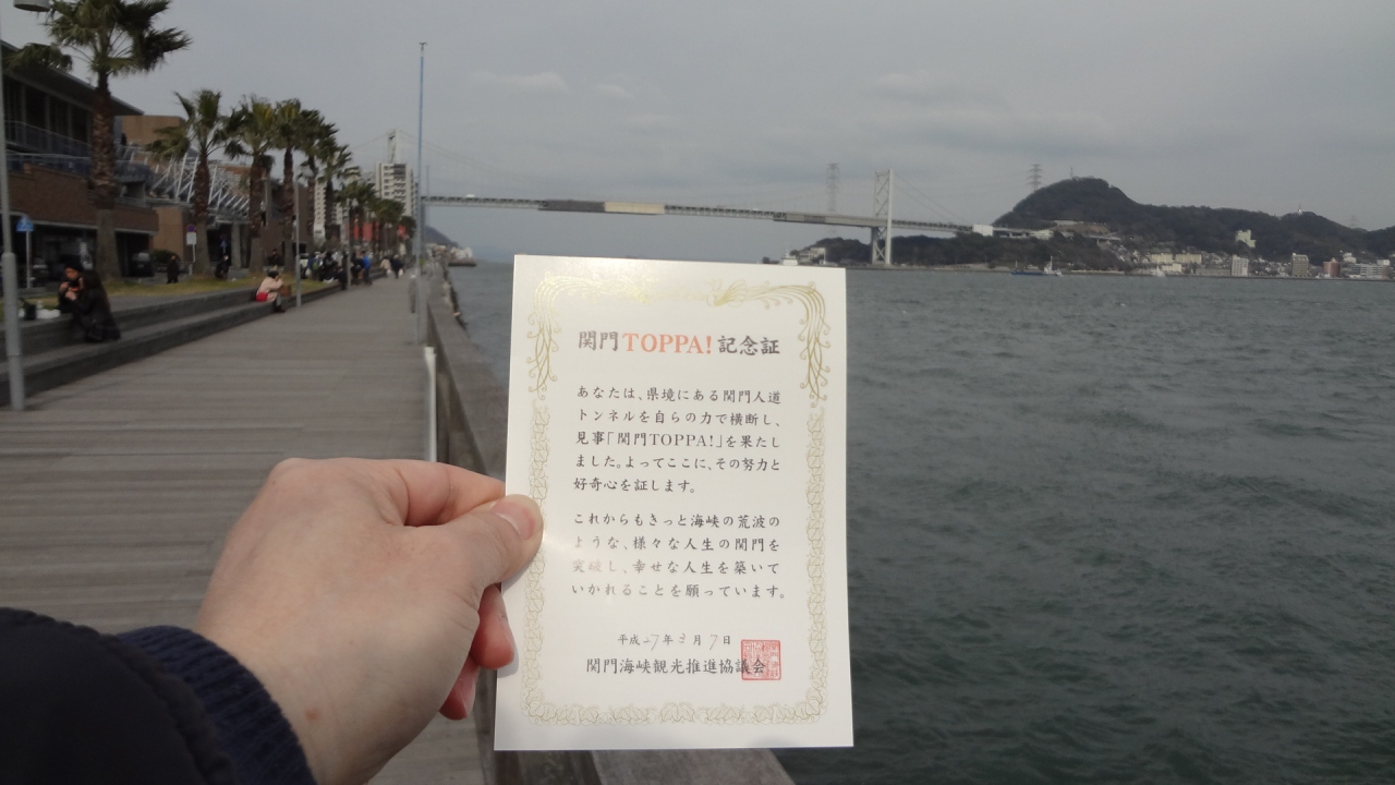 門司側もしくは下関側から関門海峡を歩いて渡れるトンネルです。歩く場合は無料です。入り口からエレベータで降りて800mほどトンネル内を歩きます。途中で県境を越えます。トンネル両端に備付のマップに門司側と下関側のスタンプを押して指定の場所に持って行くと関門TOPPA!記念証が無料でもらえます。