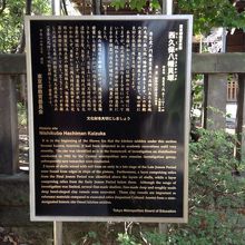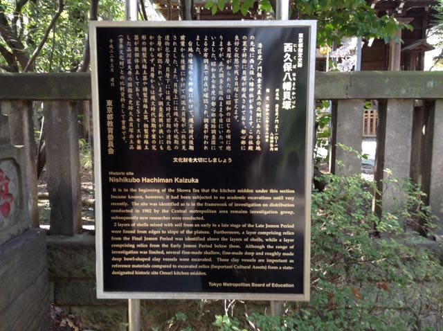 神谷町からすぐの西久保八幡神社にあります。社殿前の立て看板の説明文によると社殿の裏の斜面にあるそうです。神社自体、大都会の真ん中に、ぽっかりとタイムスリップしたような田舎の小山というか林のような空間ですが、さらに縄文時代の貝塚まで遡れるのかと思うと感慨深かったです。