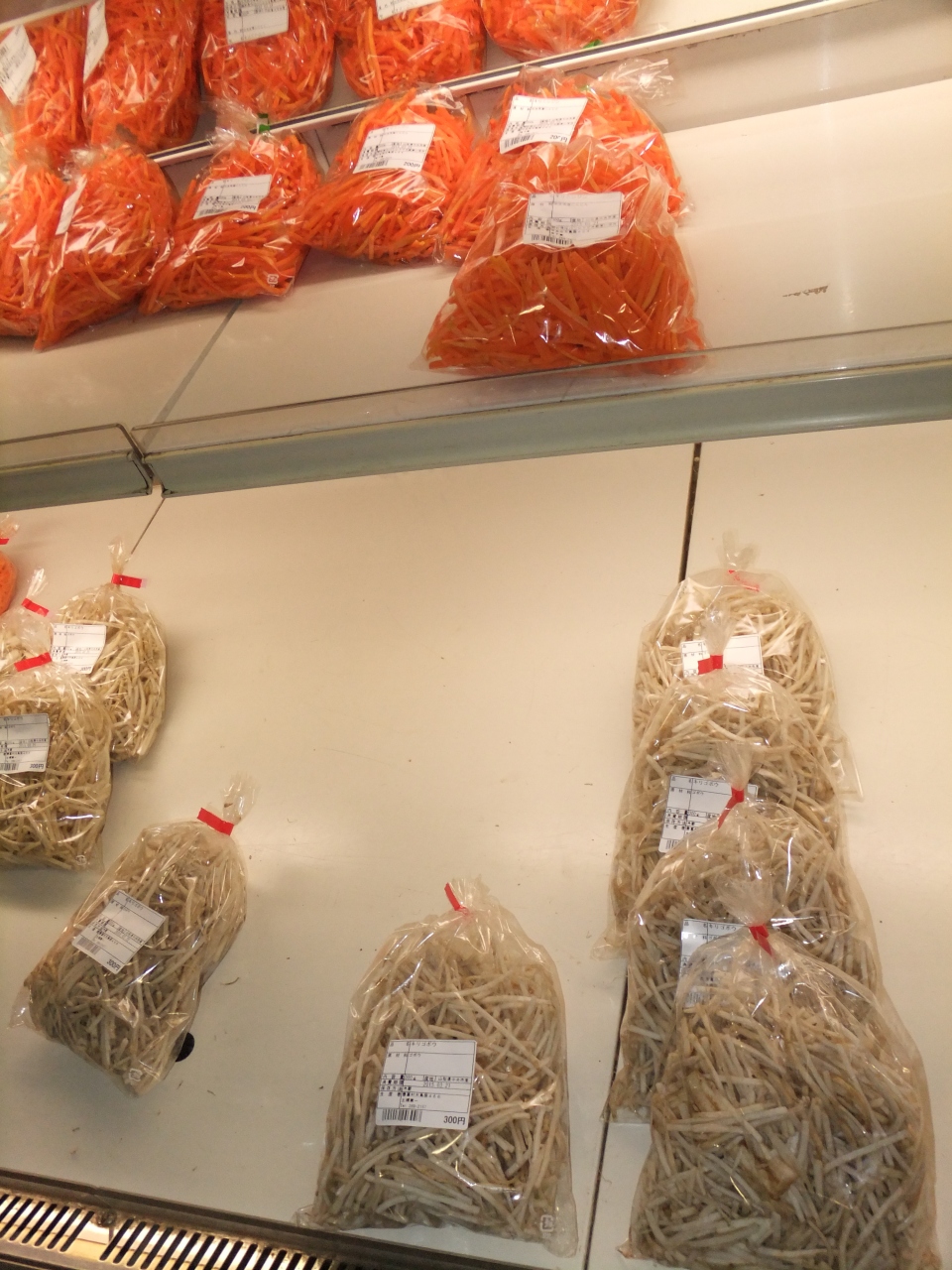 産地直送野菜も豊富で、せん切りのゴボウが300円であったので、迷わず購入しました。これだけの量と、手間たいへんですものね^^。