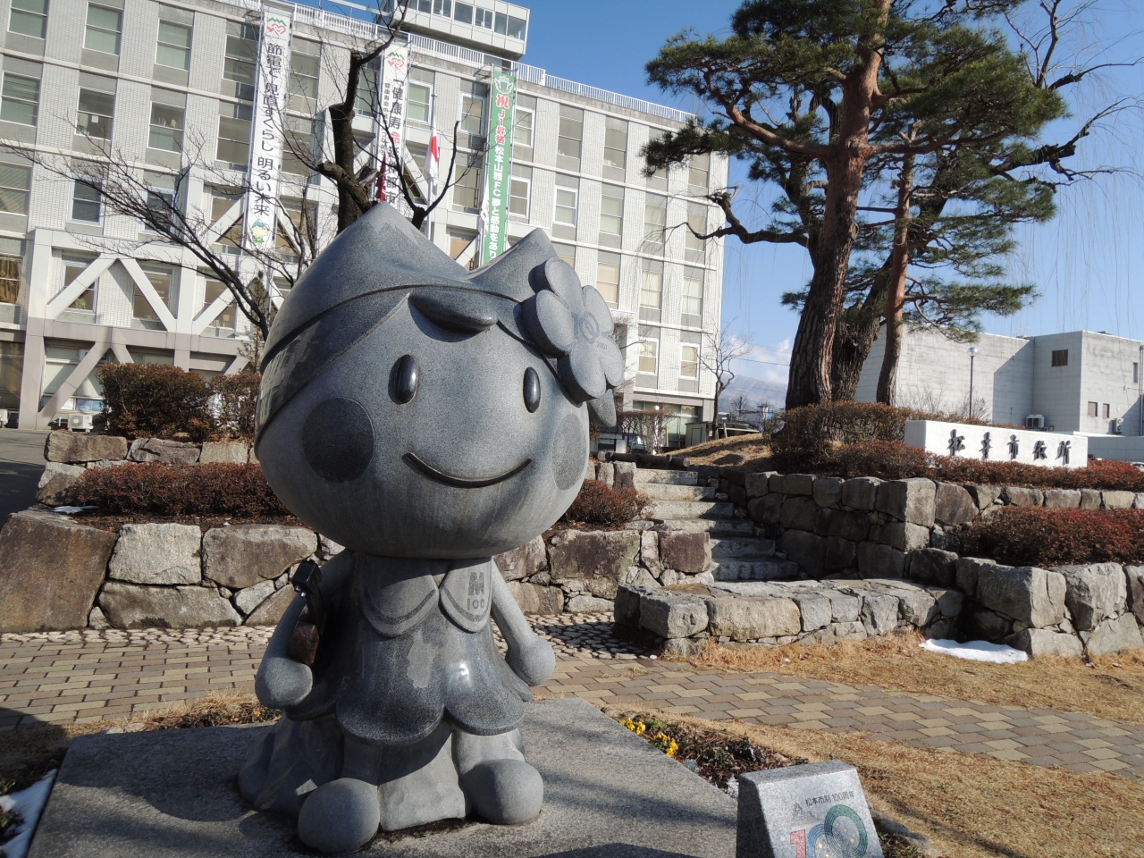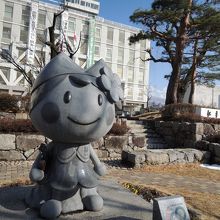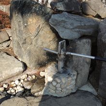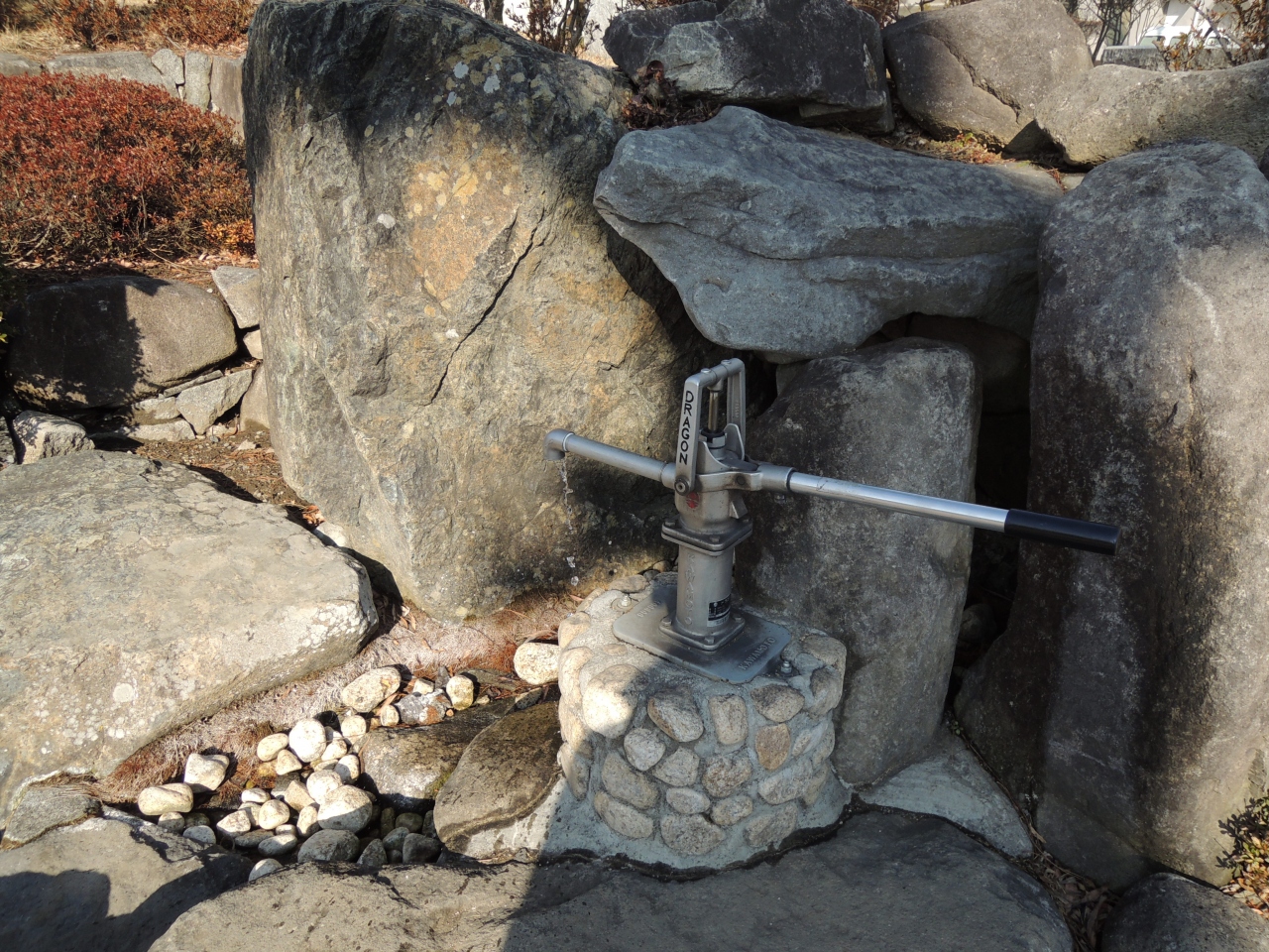 ここの名水は他と違って自分で手押しポンプを使い水を汲み上げるので少し楽しさがありますよ。その横には石でできたキャラクター的な像がたっていてかわいいです。