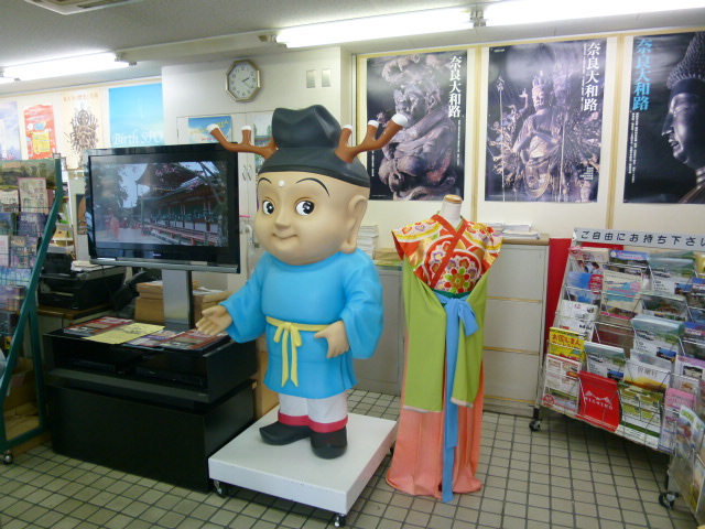 奈良へのアクセスはJRでも行くことが出来ますが、近鉄は奈良公園や東大寺へはより近いので多くの観光客が利用しています。奈良は観光地らしく観光図や標識、また観光案内所が豊富ですが、やはり観光するに最も必要な観光地図やパフレットは欠かせませんね。ここでも遷都くんが迎えてくれます。さぁー入って情報をゲットです。
