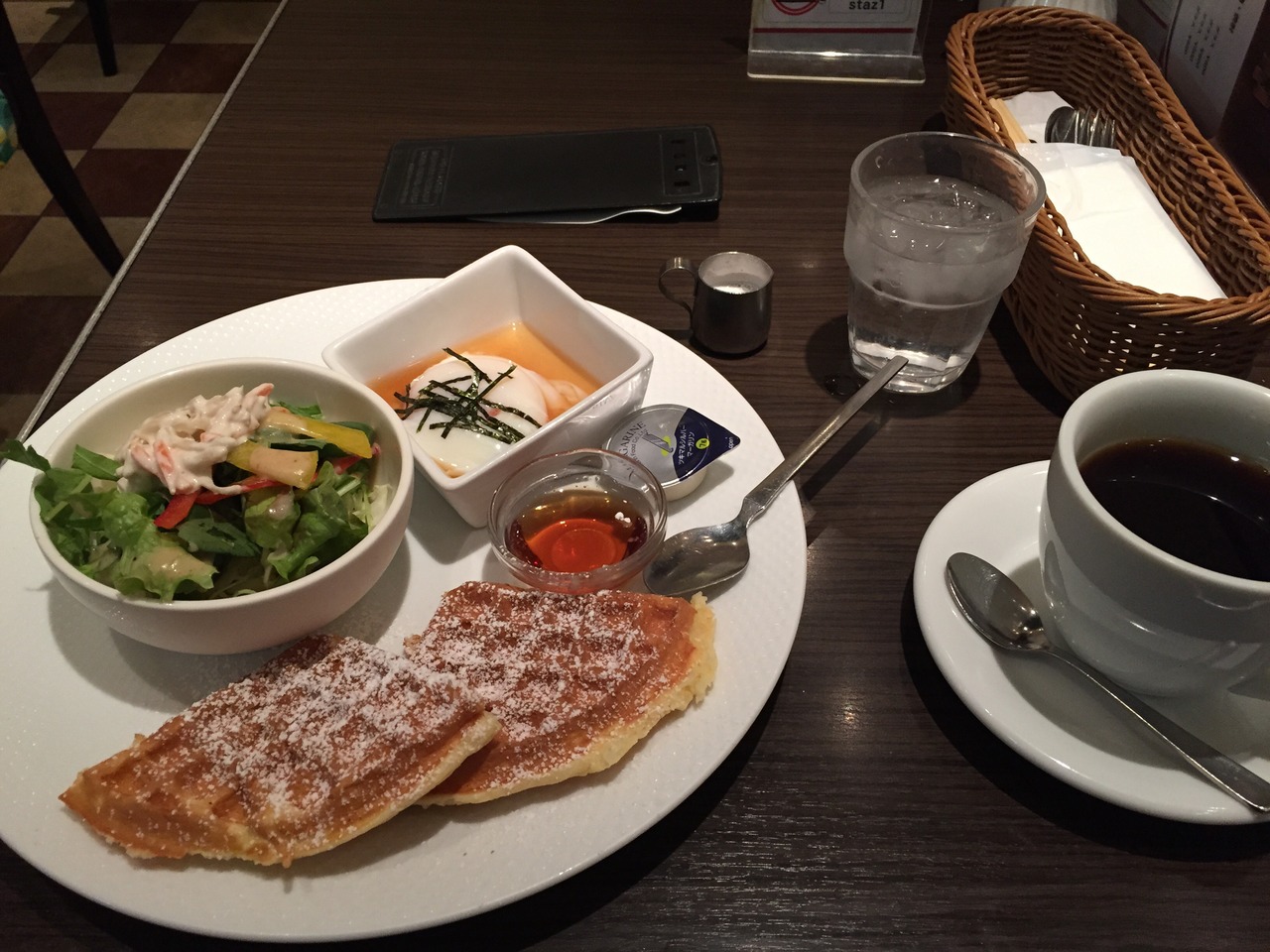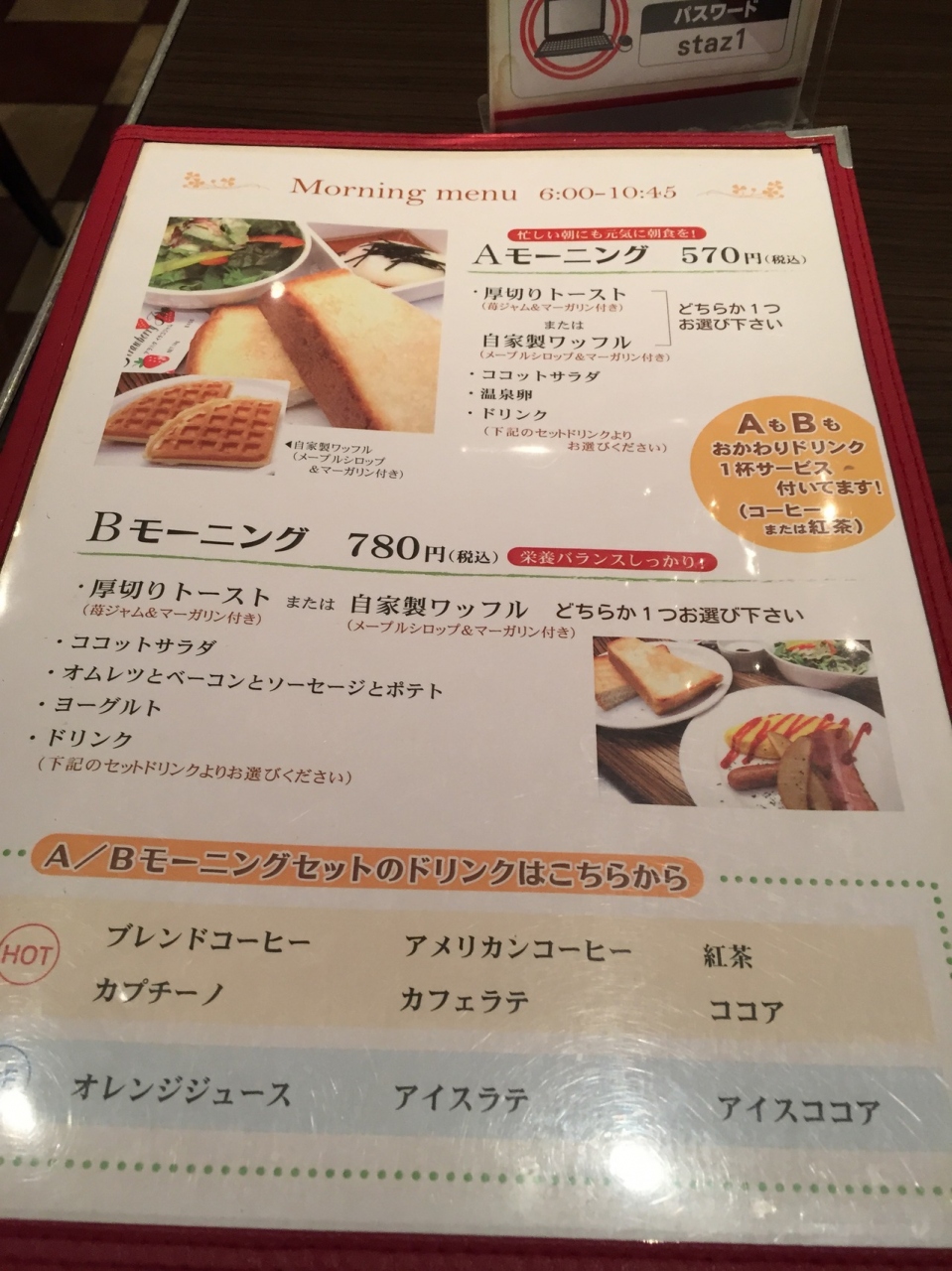 モーニングA《サラダ、温泉たまご、ワッフルorトースト、ドリンク》500yen→570yenになっていました。ただし、以前は、おかわりコーヒーor紅茶が150yenでしたが、今は一杯無料サービスなので、コーヒー好きや時間に余裕がある人は値下がりイメージですね。消費税も上がったのにエライ! と満足度向上デス