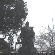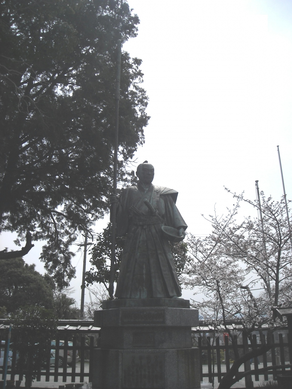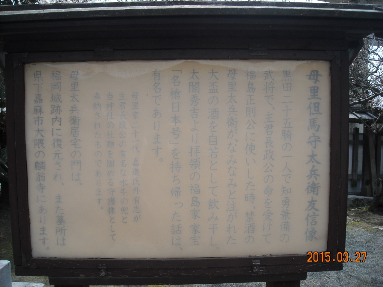 光雲神社にあった『母里太兵衛像』。(博多駅にもある)黒田家臣団18000石の城もち武将。博多人形の代名詞みたいな物で知らずともみているはず・・・。杯の酒を飲んだら槍を賭けようというので結果飲みきってしまった、これを謡ったのが筑前今様、戦後NHKのアナウンサーが放送中咄嗟に黒田節と紹介した。