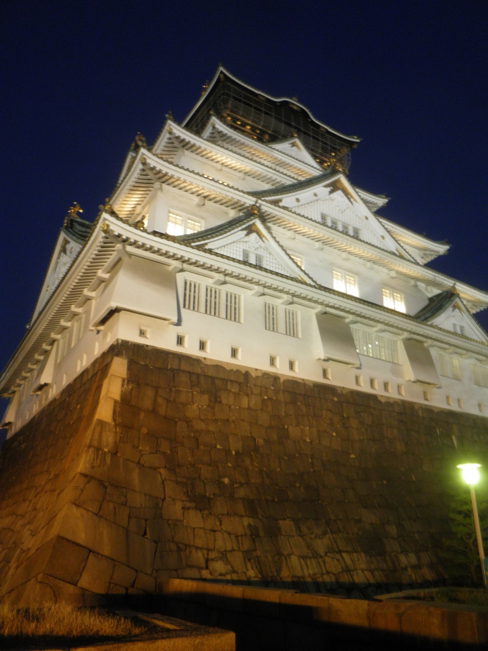 3月下旬に大阪城を観光しました。 大阪地下鉄の宮の森駅をおりてしばらく歩いていくと、遠くに天守閣が見えてきました。 夕暮れ時だったので、天守閣のふもとに着くときにはあたりは薄暗くなっていました。 白い外壁はライトアップされていた、昼間とは違った感じでした。 昼間ほどではないにしろ観光客も多くいて、小高いところなので、大阪の夜景も楽しむことができました。