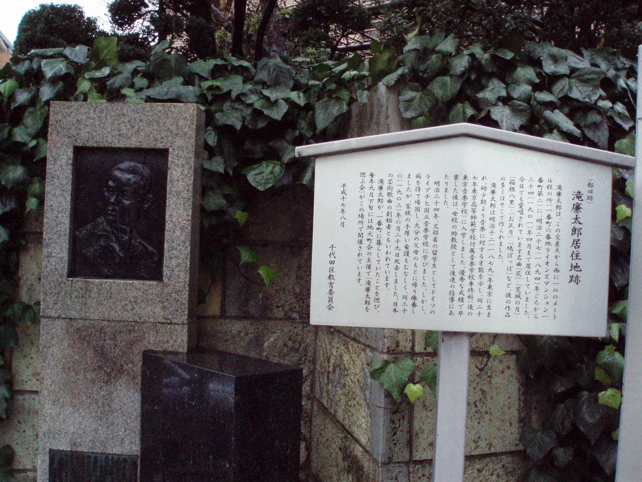 東京メトロ半蔵門線半蔵門駅すぐ永井坂を靖国神社方面へ歩行き袖摺坂を上った交差点の左側に滝廉太郎居住地跡の碑に歩いて7分ぐらいで着きます。滝廉太郎居住地跡の碑には