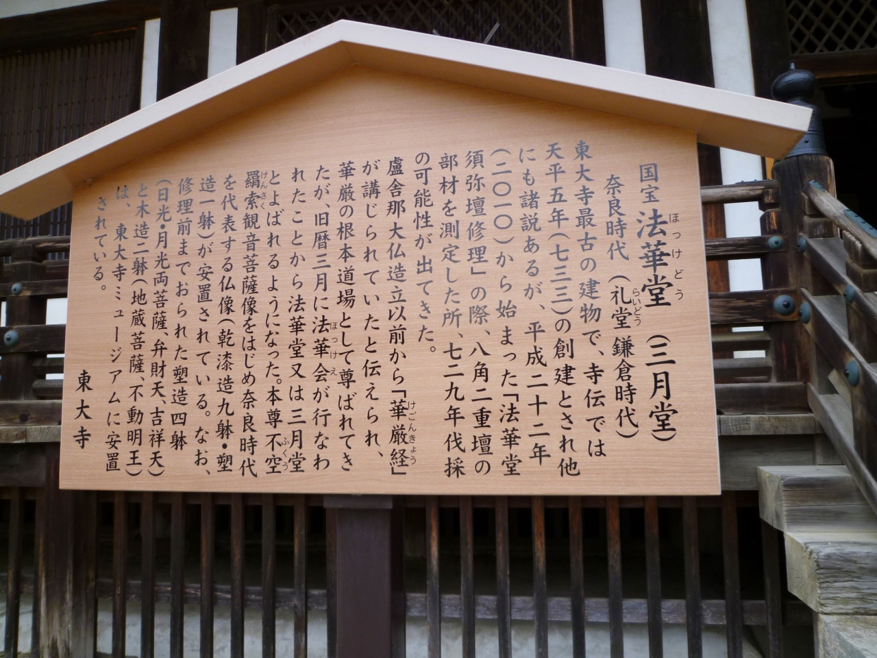 東大寺最古の建物だという。毎月3月に法華会が行われたことから、法華堂と呼ばれることになったらしい。東大寺の前身である金鐘寺の主要伽藍のひとつで、このお堂で華厳経が日本で初めて講義されたという説があるらしい。国宝。