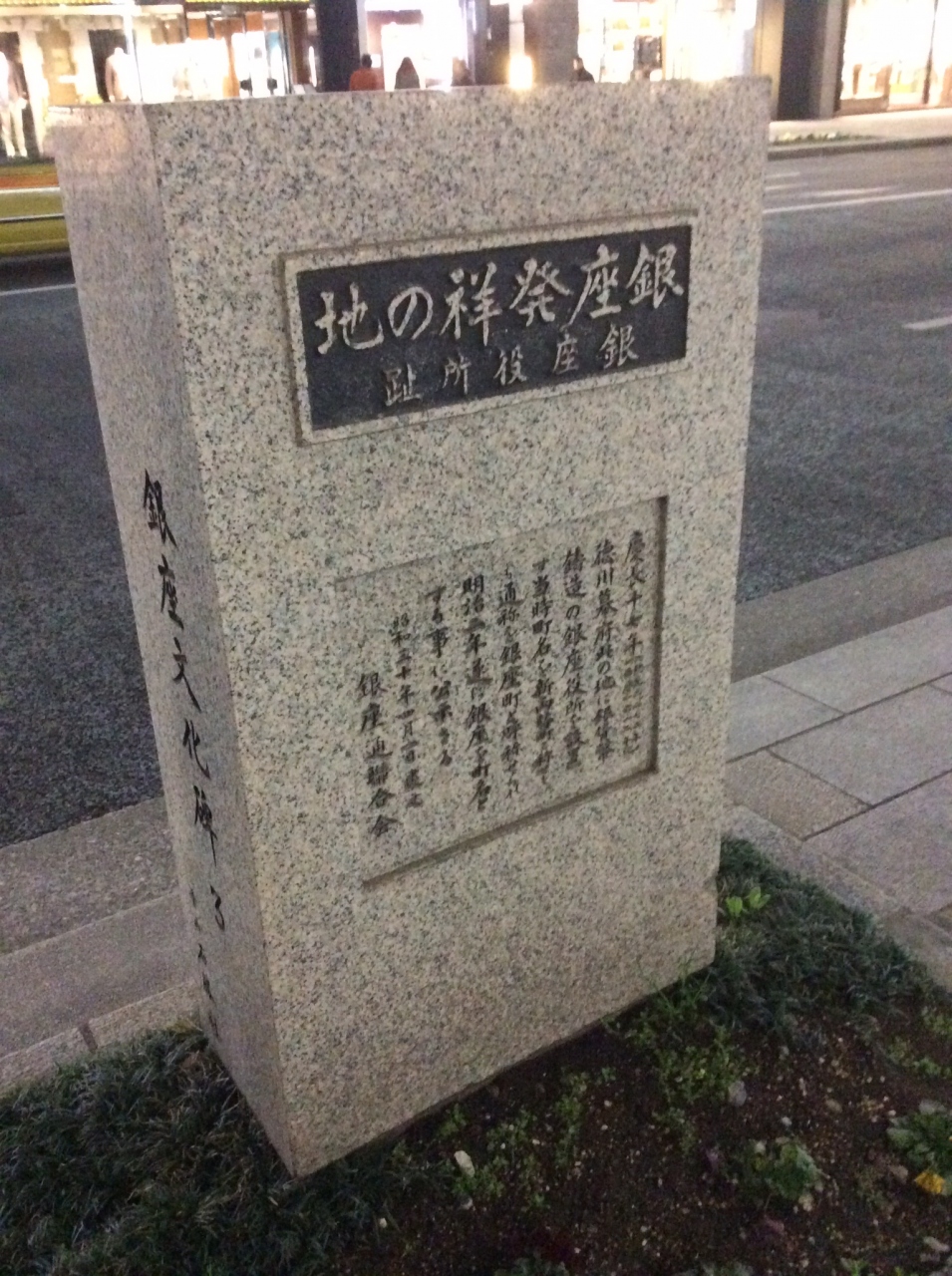 中央通り沿いの銀座2丁目のティファニー前にあります。銀座とは江戸時代に銀および銀貨の鋳造、取締りを司った幕府の機関のことで、駿河に設けられたものが現在の銀座2丁目に移されたことが銀座の地名の由来のようです。