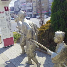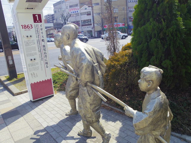 大山巌、西郷従道、山本権兵衛の3人の像です。鹿児島市市電の加治屋町で下車して交差点の北東にあります。薩英戦争の頃、イギリス艦隊入港の知らせを聞いて3人が大慌てで港へ駆けつける様子があらわされていて関心をひきました。