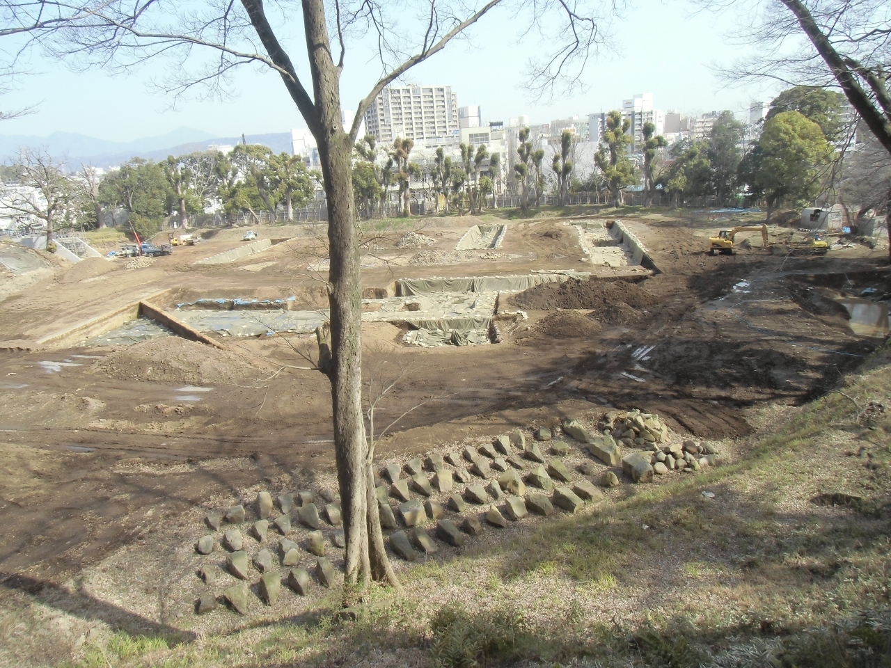 国の史跡に指定されており現在も遺構の発掘や整備復元が進められおり、天守閣や平成9年に銅門(あかがねもん)、平成21年に馬出門が復元されました。ちょうど、天守閣の東側にある御用米曲輪が発掘調査されていました。