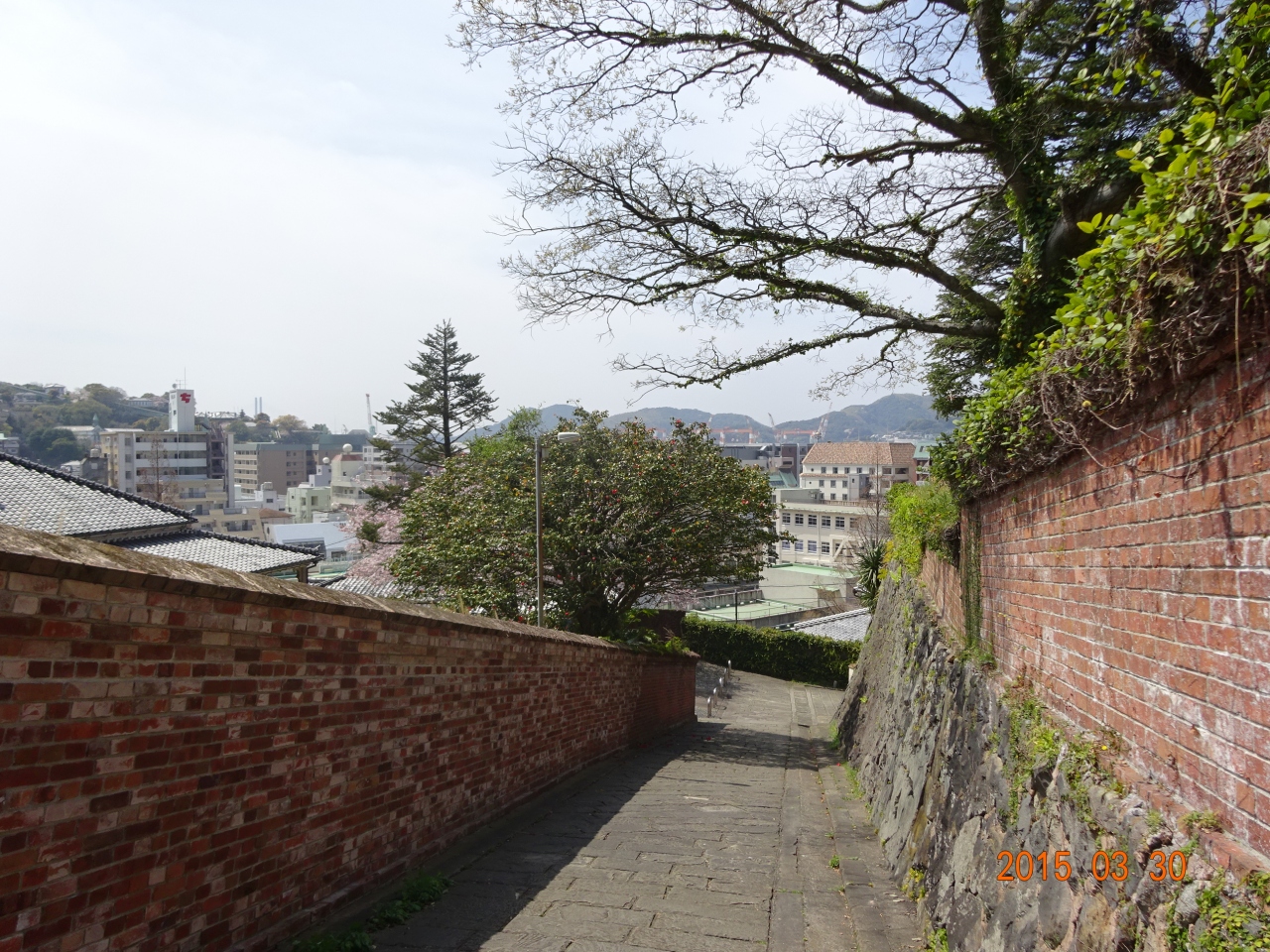 そのまままっすぐ坂を上がって、途中分かれ道がありますがそのまま右手に坂を上がります。そして左側に活水短大の入口が見えたらそのすぐ手前にある坂をおりなければなりません。