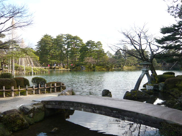 兼六園霞ヶ池は園内のほぼ中央にある大きな池です。池の真ん中に蓬莱島、兼六園で一番有名な場所ことじ灯籠があります。兼六園は何か所も入口があり、周遊バスが止まるバス停からは桂坂口から入り、人の行く流れについて行くと着きます。