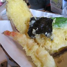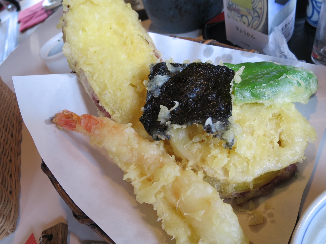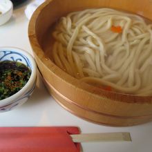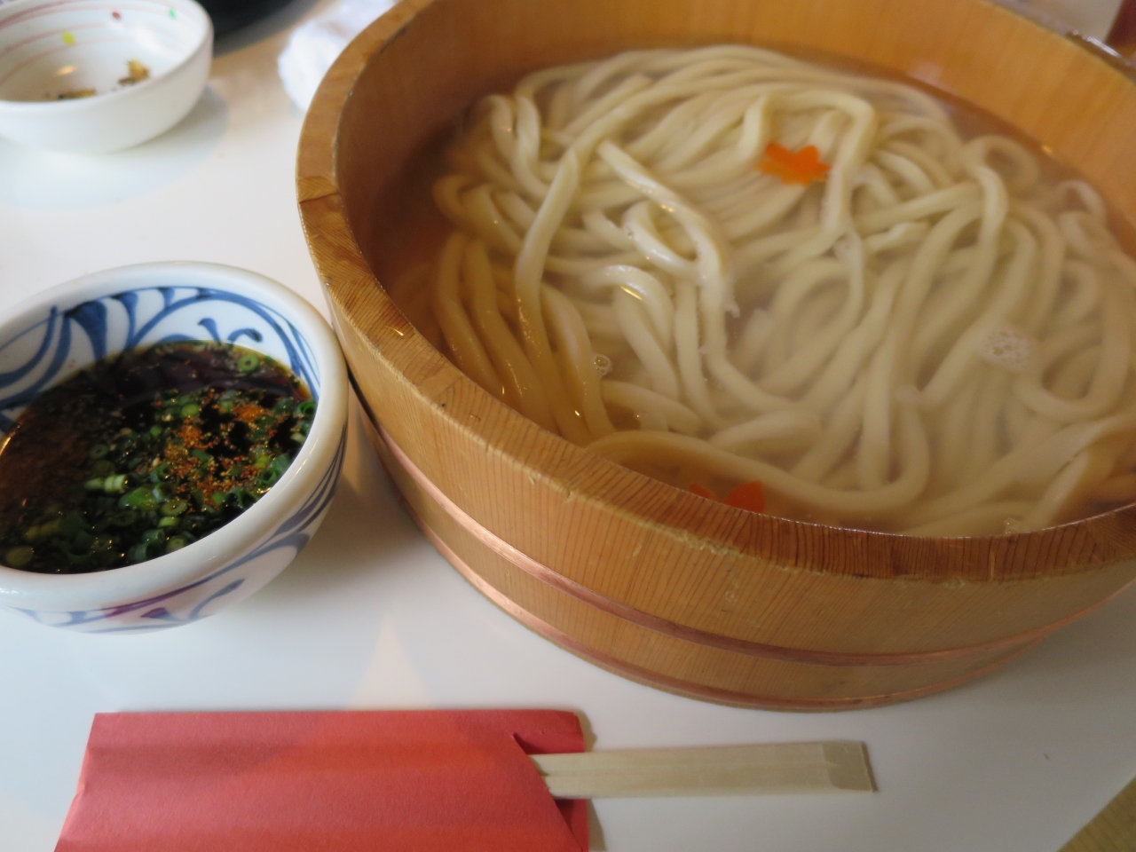 たらいうどんと天麩羅を戴きました。うどんは、とても太く食べ応えのあるうどんで、つゆには1本しか入れられない程です。天麩羅のさつま芋もとてもBIGです。