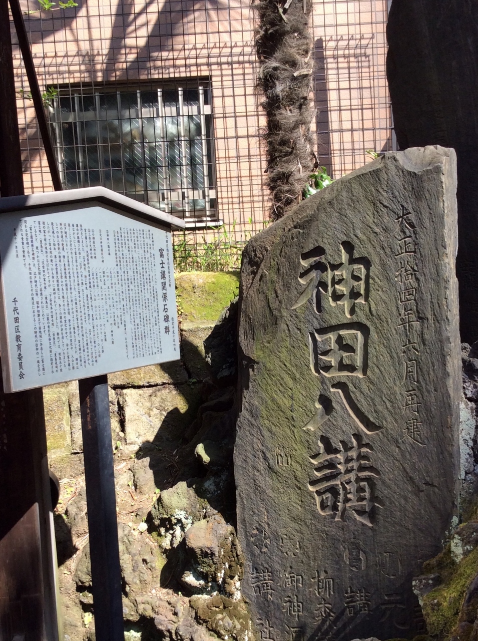 神田ふれあい橋を渡った先にある柳森神社の中にあります。富士講とは、江戸時代富士山を信仰対象として崇めた講組織で、代表講員が富士詣を行う代参講の形をとっていて、講の所在地には富士山に見立て黒ぼく石で富士塚を築き、毎年の山開きに富士詣でと称して登る行事が行われていたそうです。