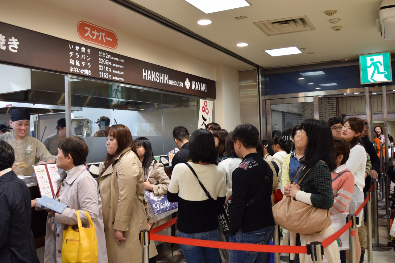 平日の昼間でも、長い行列が絶え間なくつづく名物のB級グルメが阪神デパート地下にある、いか焼きである。