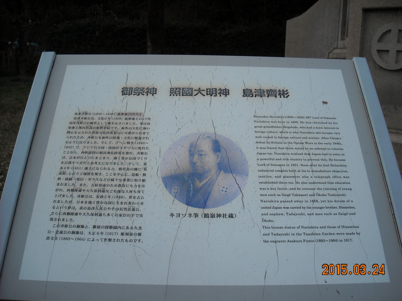 幕末期の島津家殿様・成彬公を祀る。大河ドラマではとても英明な殿で西郷隆盛を抜擢、あるいは篤姫を十三代将軍家定に嫁がせたりと積極果敢に動き回ったが50歳で病没。日本国中の全大名の中でも一際目立った功績を残した人かもしれない。当時の殿様に参政権が無かったようなもの。