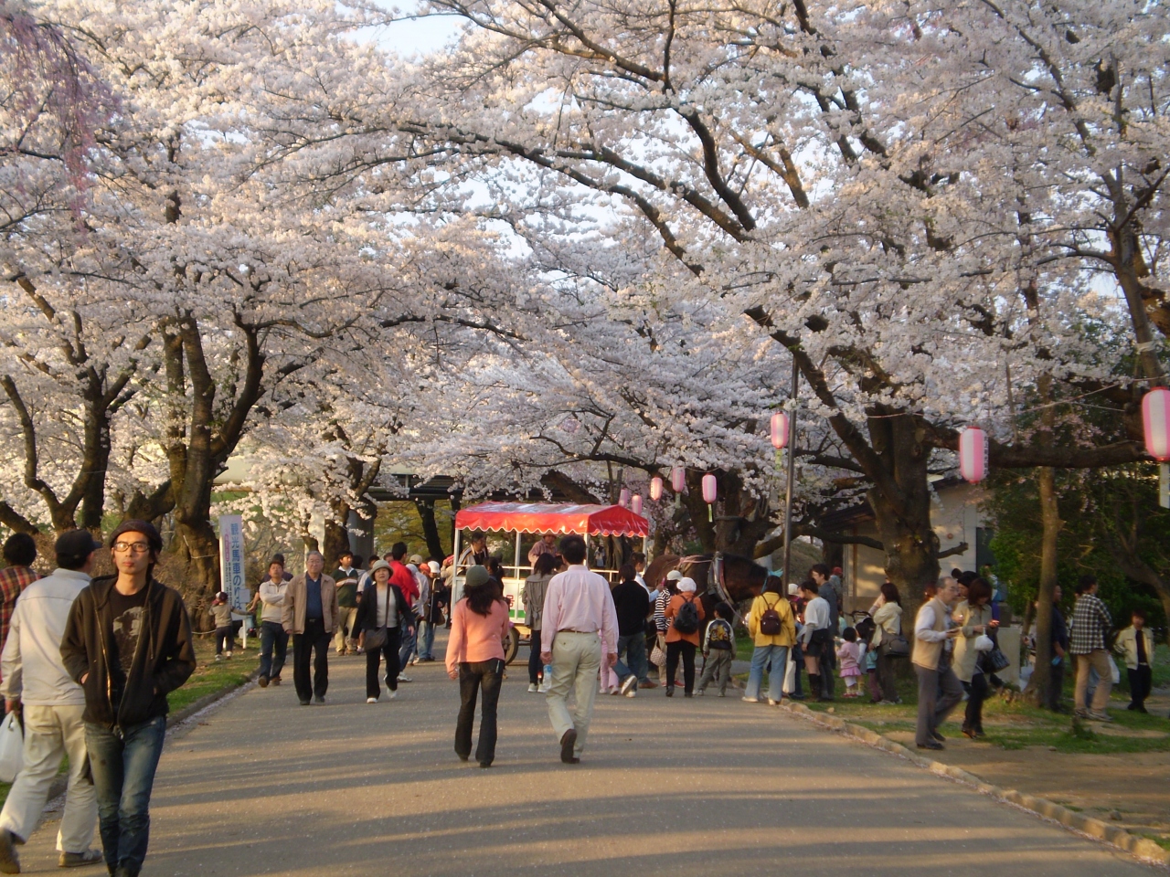 花見の期間は馬車が並木道を通ったり、おいらん道中があったりと趣のある風景も楽しめるのですが、レストハウス付近には屋台がたくさん並び、様々なイベントもあるので家族はもちろん、皆で楽しめると思います。