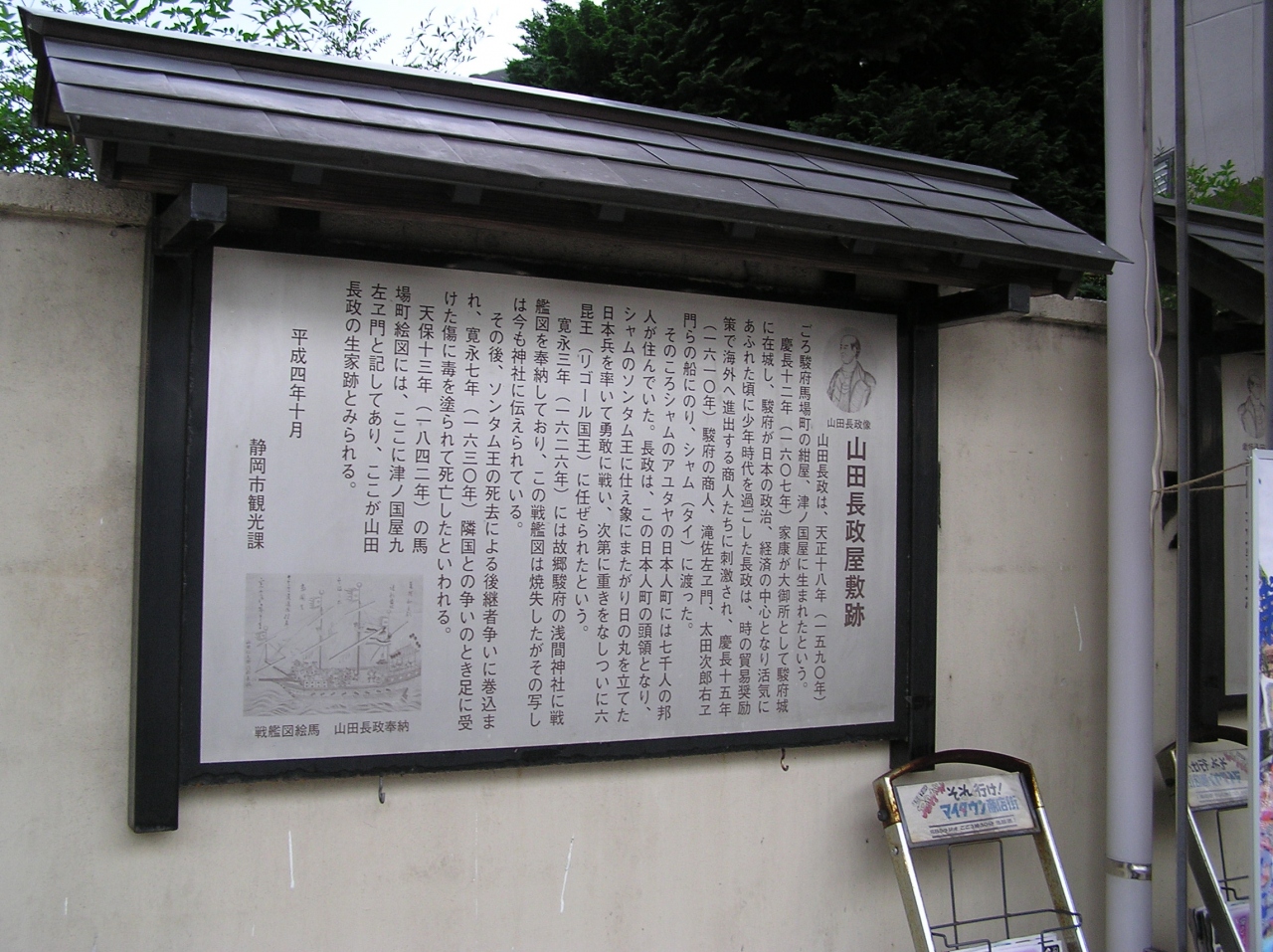 山田長政は、1590年ころ駿府馬場町の津ノ国屋に生まれたとされる。1842年の馬場町絵図には、この地が「津の国屋九左ヱ門」と記されてあり、ここが山田長政の生家跡と認定された。